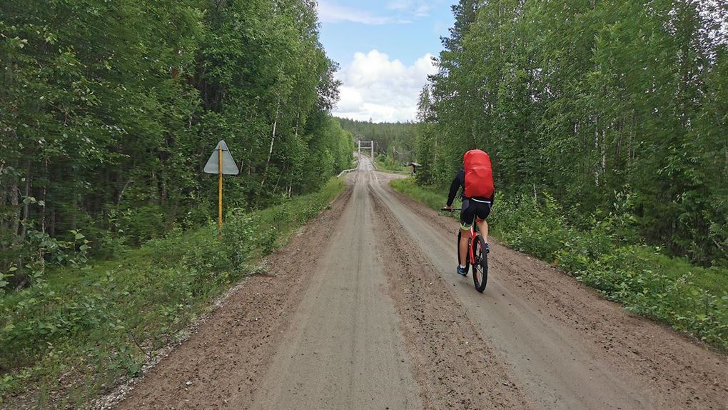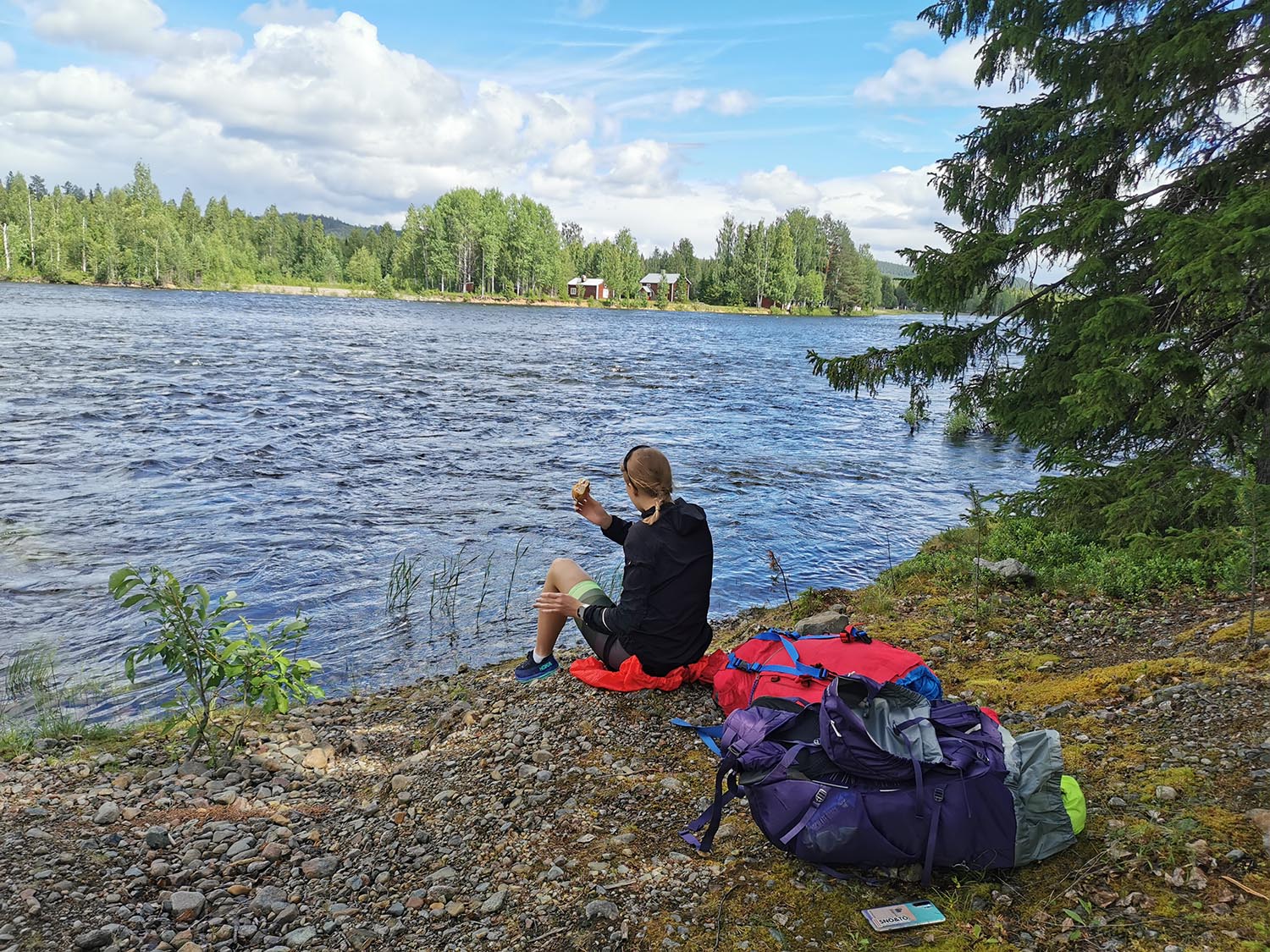 Vi cyklade ner till älven på ett ställe och tog lunch. Goda baguetter med färskost/mozzarella, tomat och lufttorkad skinka. Gott att kunna ha med så lyxig lunch. Rasmus som är helt fisketokig passade även på att kasta några kast men utan napp. Under lunchpausen startade vi vår nyinköpta Thermacell, en slags myggjagare, som vi var otroligt tacksamma att vi hade. För mygg var något det fanns gott om, på hela vårt äventyr.