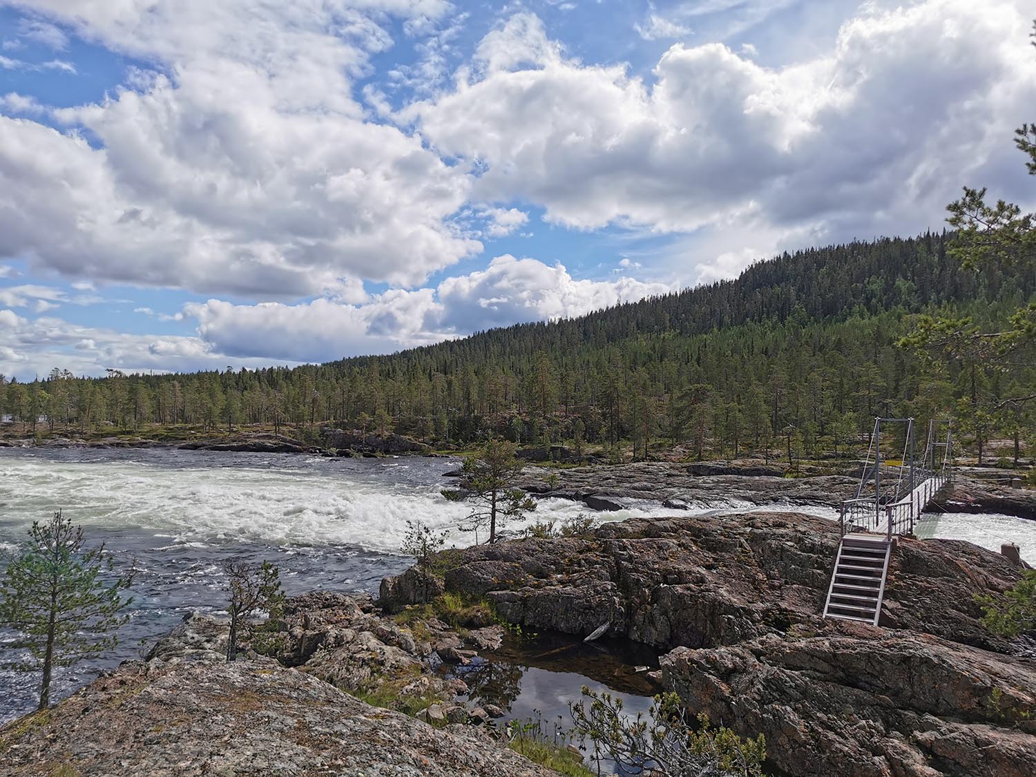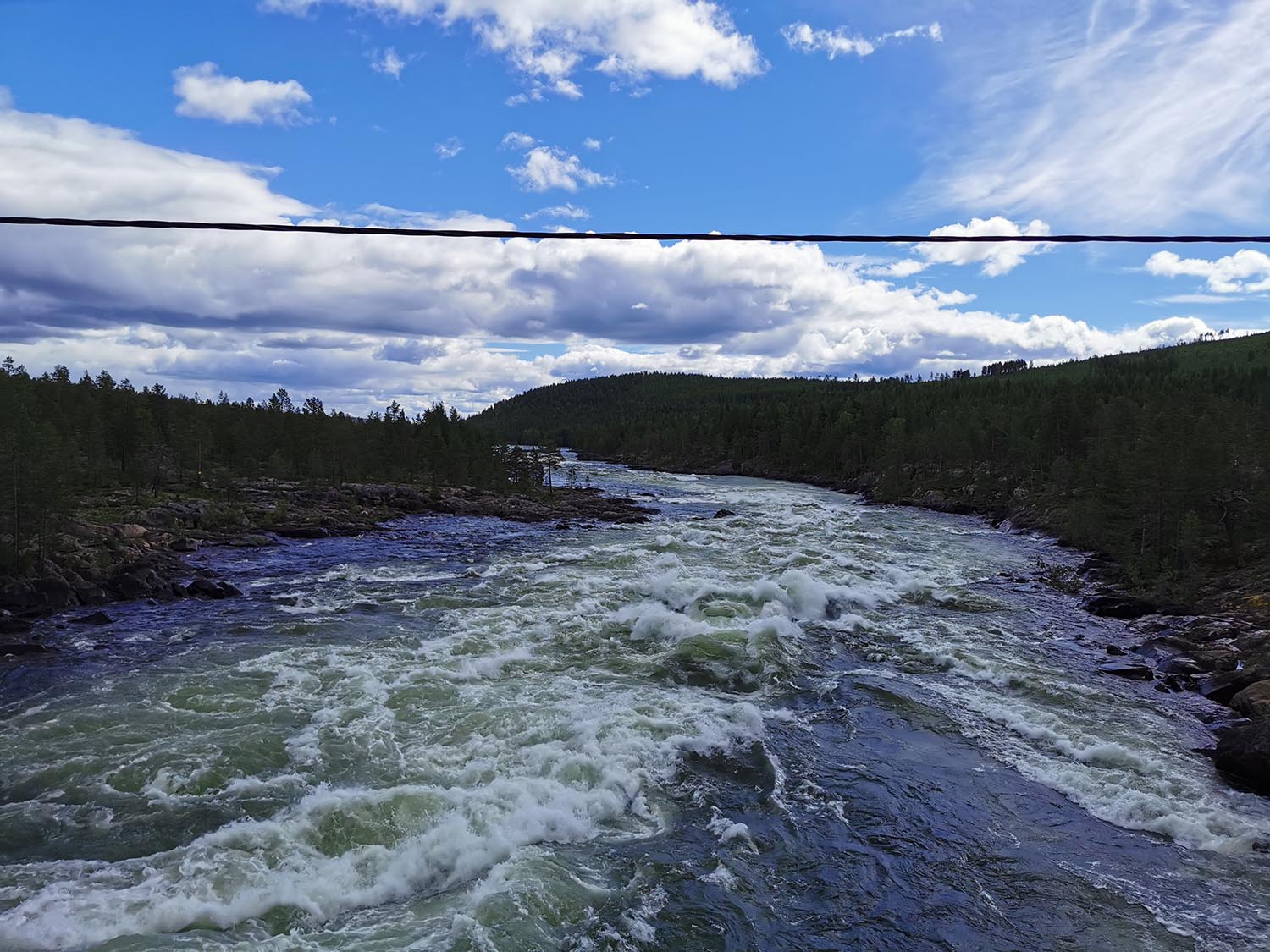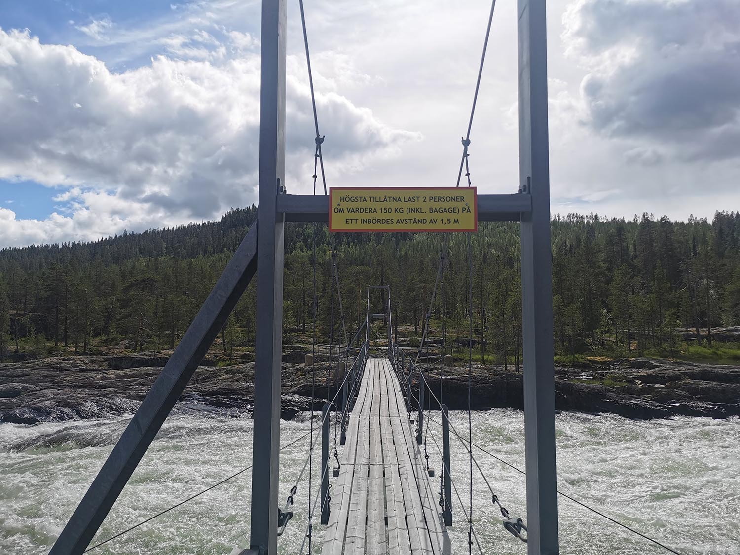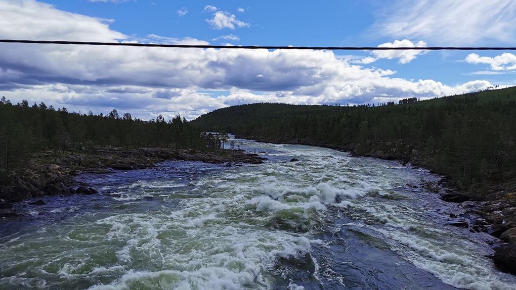 Sedan var det dags att gå ner igen. Nerfärden blev betydligt lättare och snabbare än vägen upp och i och med att vi kunde springa snabbare så var inte heller myggen en lika stor plåga. Vi hoppade på cyklarna igen och fortsatte på grusvägen ut mot 45:an. Efter en liten stund var vi ute vid den stora vägen och kom till Burmabron som går över Ljusselforsen. Vi cyklade över gångbron och stannade till och tittade på forsen.