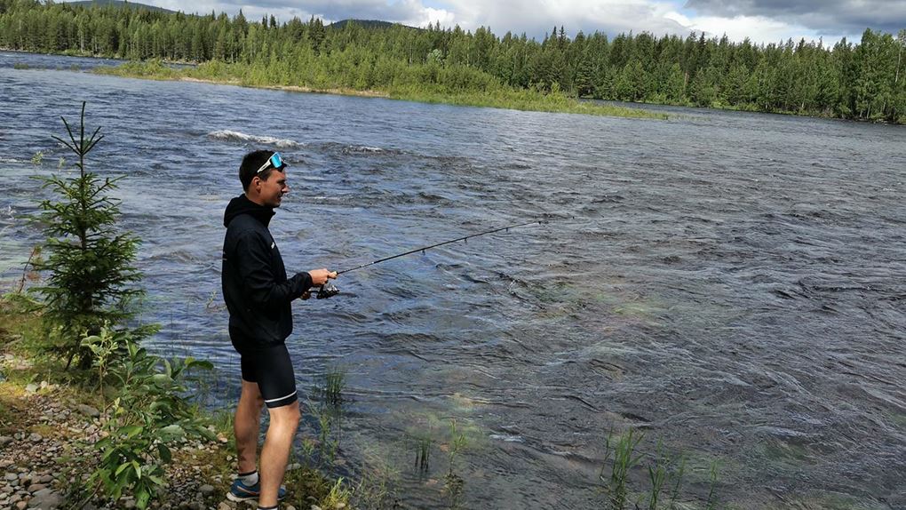 Med mat i magen gick Rasmus som tagit med sig teleskopfiskespöet ner till vattnet och fiskade, ganska länge utan något napp. När det började närma sig kvällen kom pappa för att hämta upp våra cyklar och stora packningen inför morgondagen. Han lämnade även en extra gasoltub. Efter det kunde vi göra vår kvällsgröt. Gott med mat. Jag var trött och ville sova, men Rasmus ville inte ge upp på fisket. När natten kom stod han fortfarande ute och kastade. Han fick upp en liten öring som han släppte tillbaka men även en ganska stor gädda, som även den fick simma tillbaka. Sedan var det dags att sova, och oj vad skönt att krypa ner i sovsäcken.