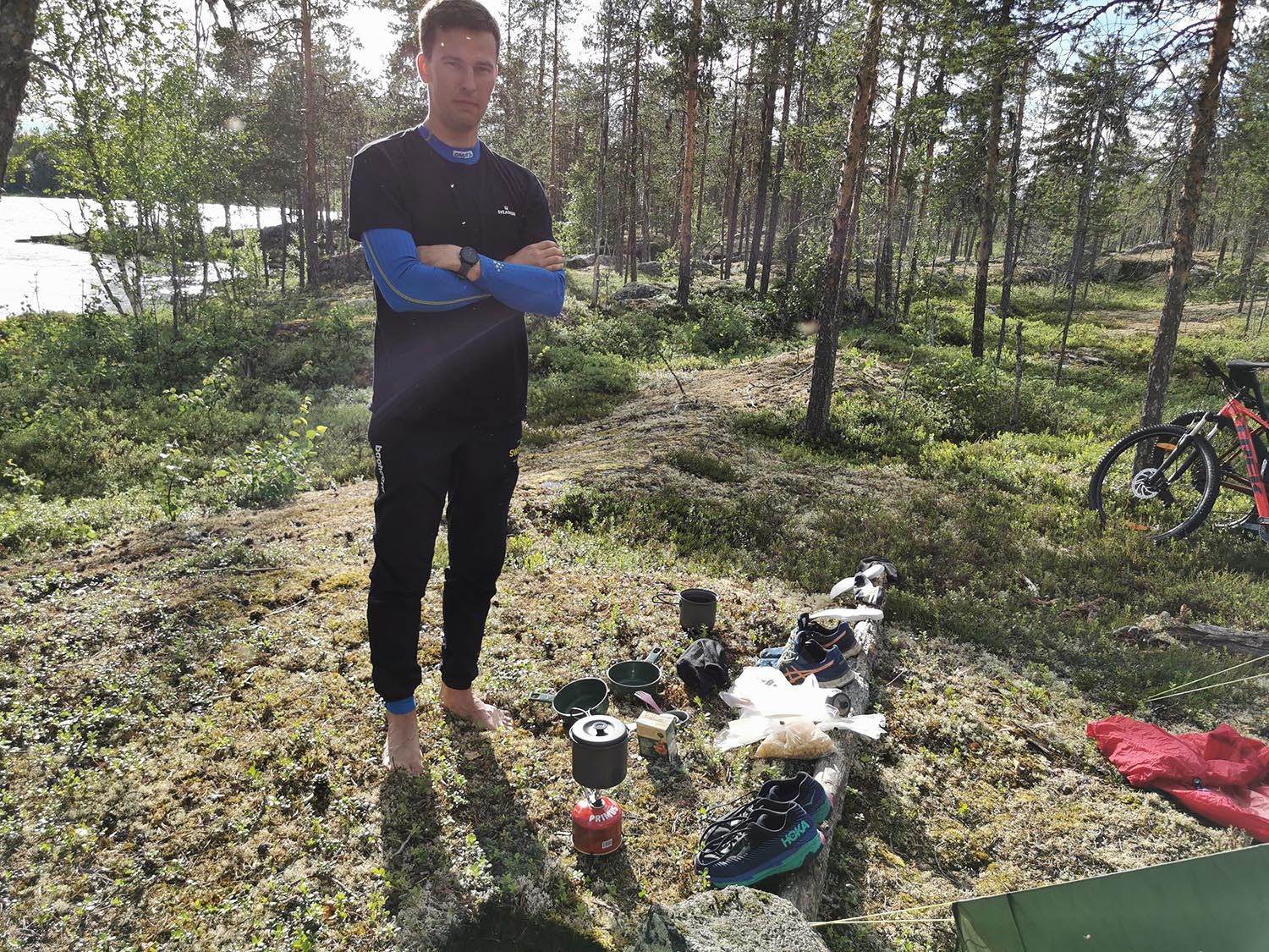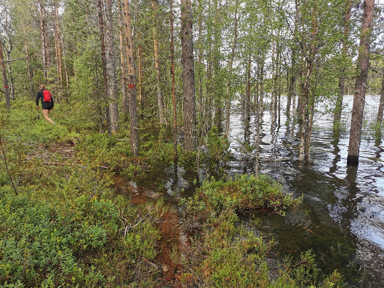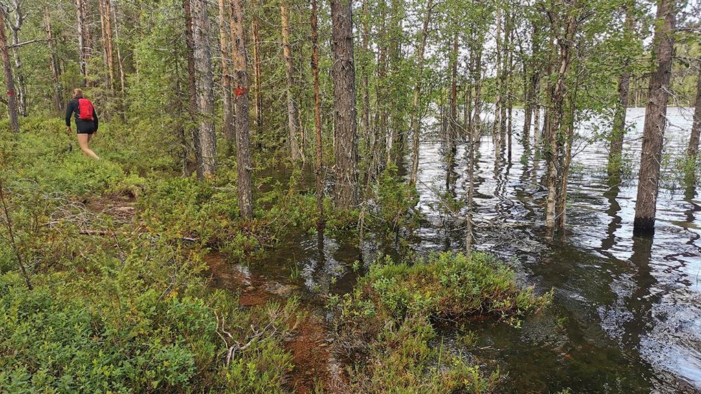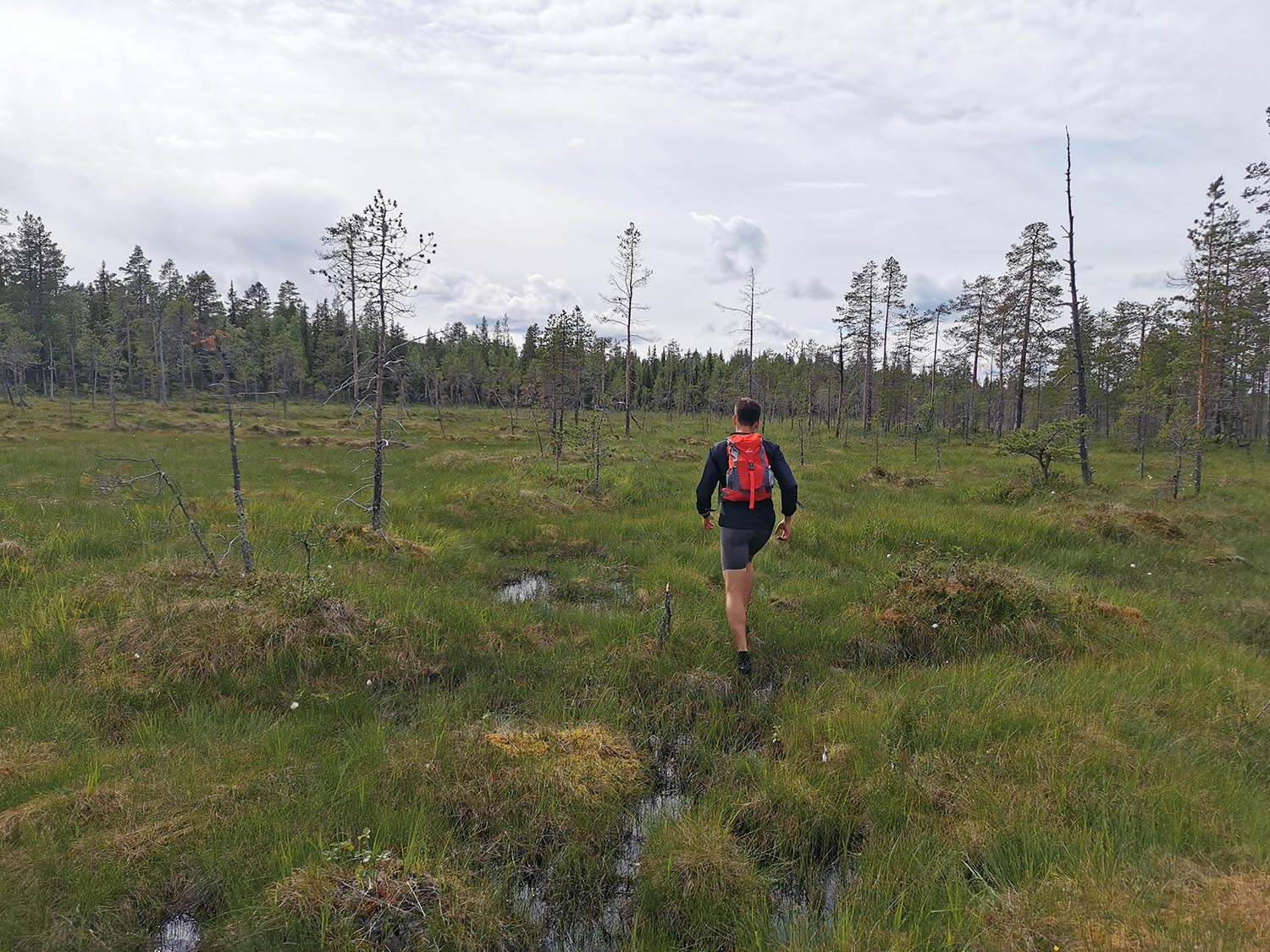 Mycket mossig mark med sten under, så det var lite trixigt hur man skulle sätta fötterna för att inte vricka dem. Uppför gick det, mygg var det och trött blev jag. Rasmus var stark och uppmuntrande och vi krigade på. Ingen av oss har nog någonsin varit med om så mycket mygg på ett träningspass, det var faktiskt fruktansvärt jobbigt. Kanske faktiskt den jobbigaste passagen på hela äventyret.