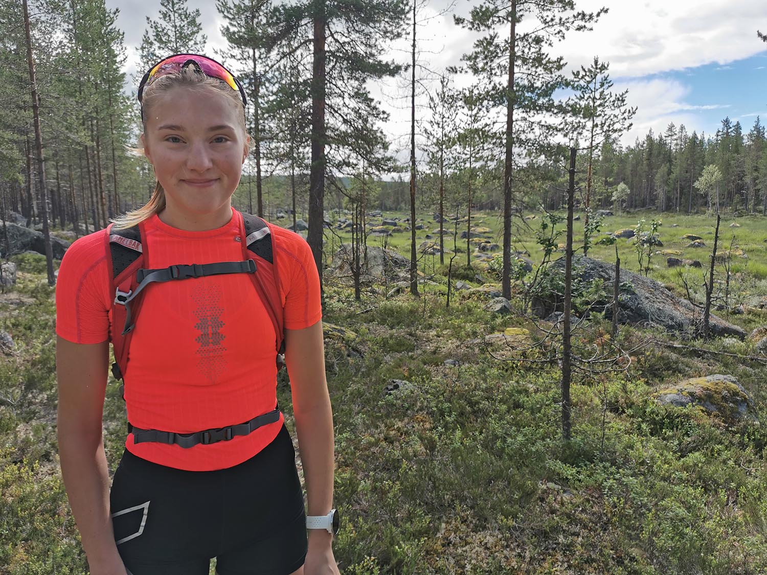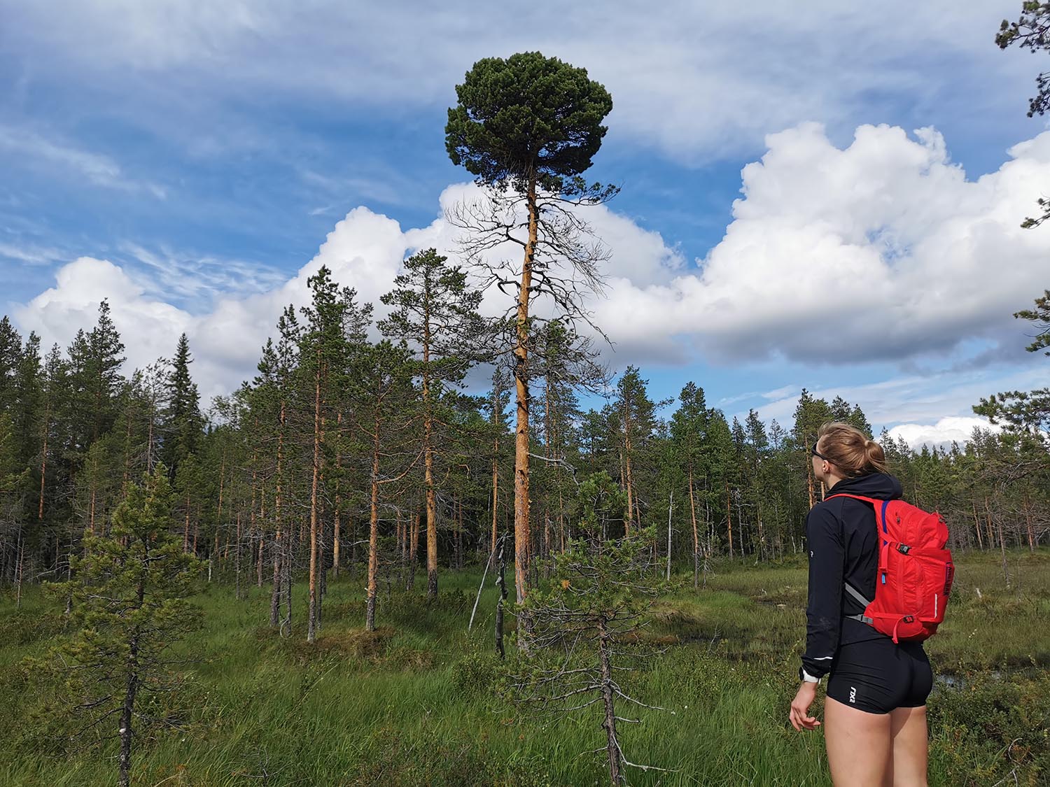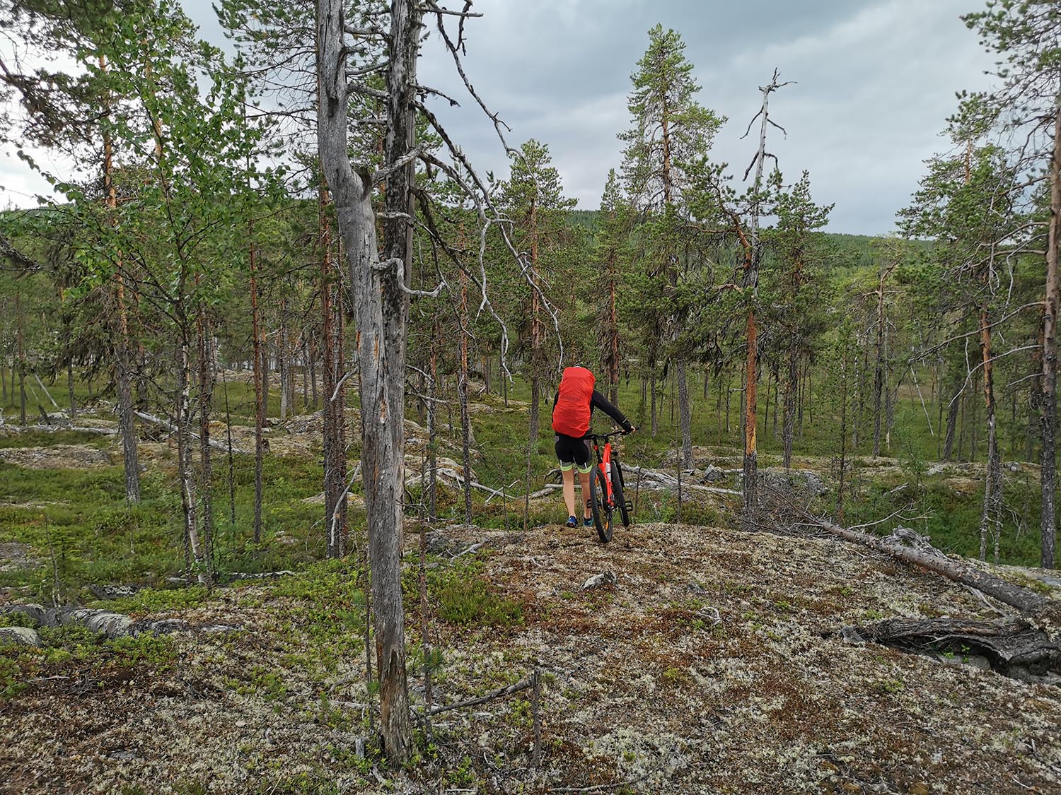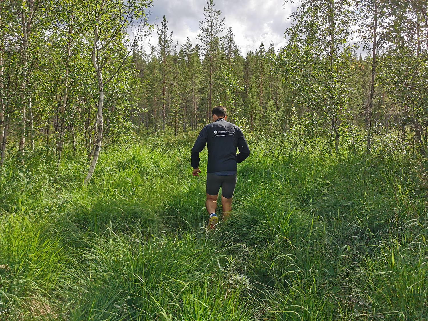 Mycket mossig mark med sten under, så det var lite trixigt hur man skulle sätta fötterna för att inte vricka dem. Uppför gick det, mygg var det och trött blev jag. Rasmus var stark och uppmuntrande och vi krigade på. Ingen av oss har nog någonsin varit med om så mycket mygg på ett träningspass, det var faktiskt fruktansvärt jobbigt. Kanske faktiskt den jobbigaste passagen på hela äventyret.
