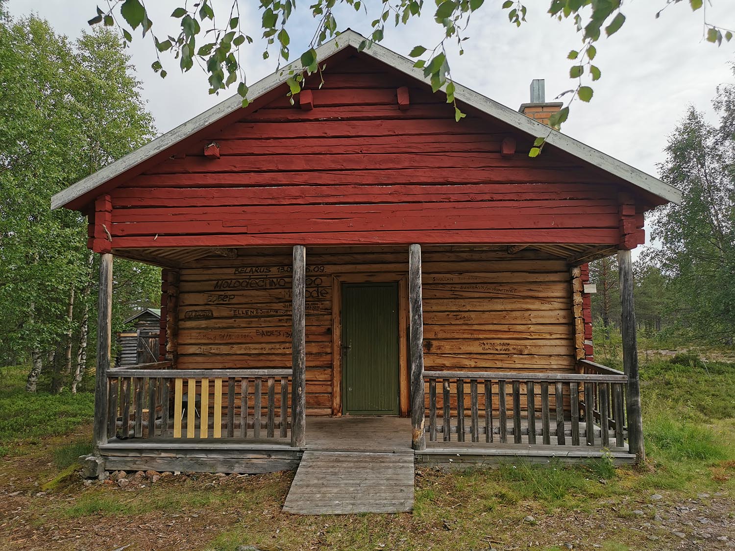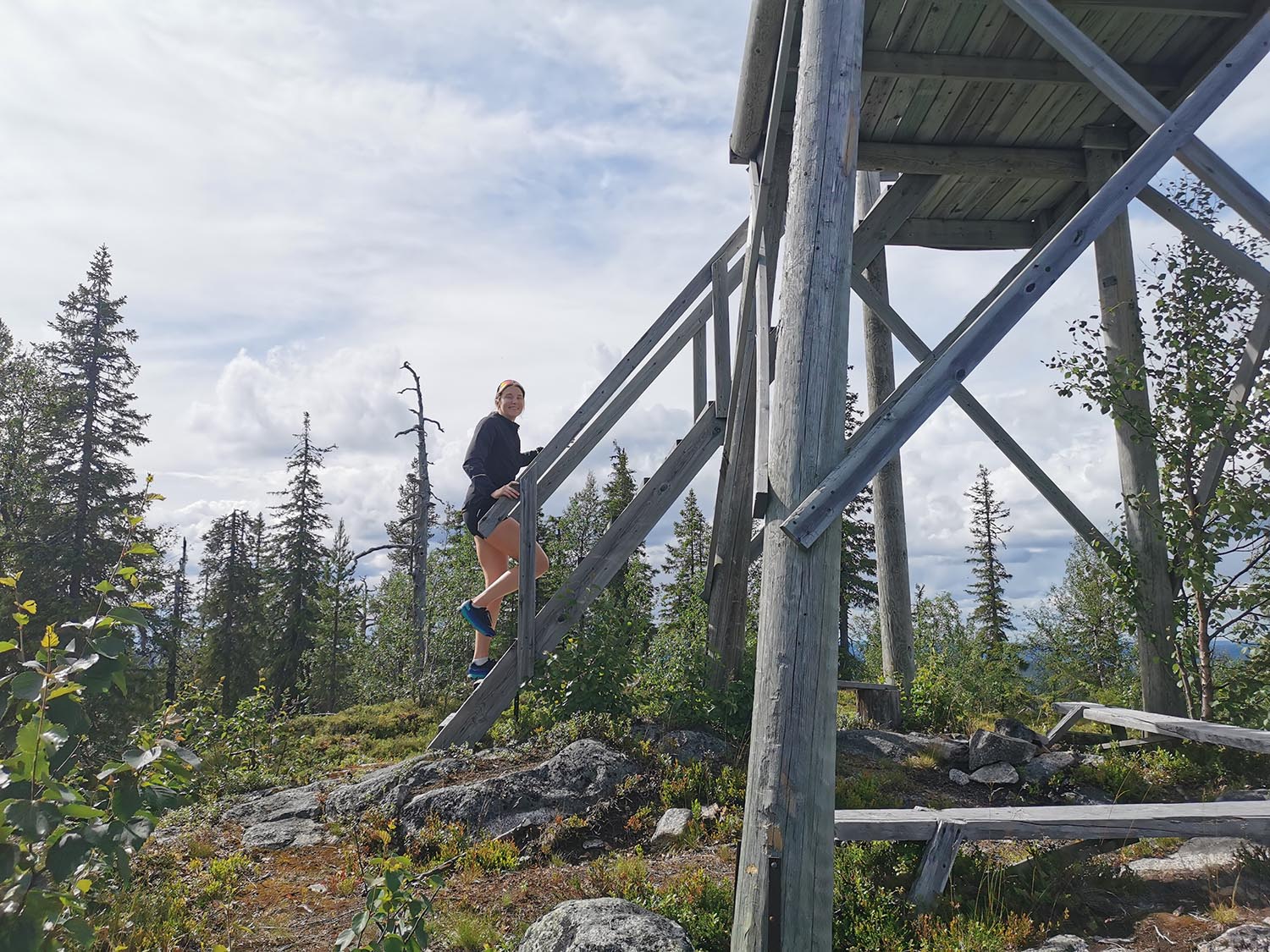 Upp till berget finns det en fin vandringsstig med lagom sluttning från andra hållet, men det skulle bli mindre äventyrligt om vi skulle cykla runt till den, så vi tog bara raka vägen upp. Och brant var det! Men upp kom vi till slut och oj vilken utsikt. På toppen finns ett utkikstorn där utsikten är helt otrolig. Vi såg långt, långt men även Piteälven med Burmabron och jag kunde peka ut ungefär vart vi skulle tälta till natten. Vi gick även in i toppstugan och flydde myggen en stund där vi kunde skriva i gästboken och äta lite bars och godis som vi tagit med i fickan.