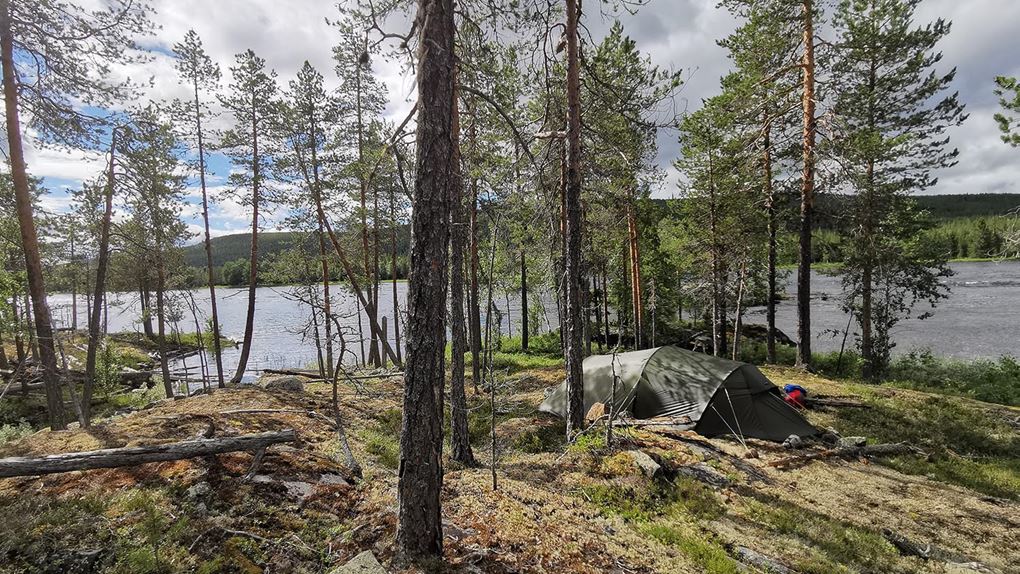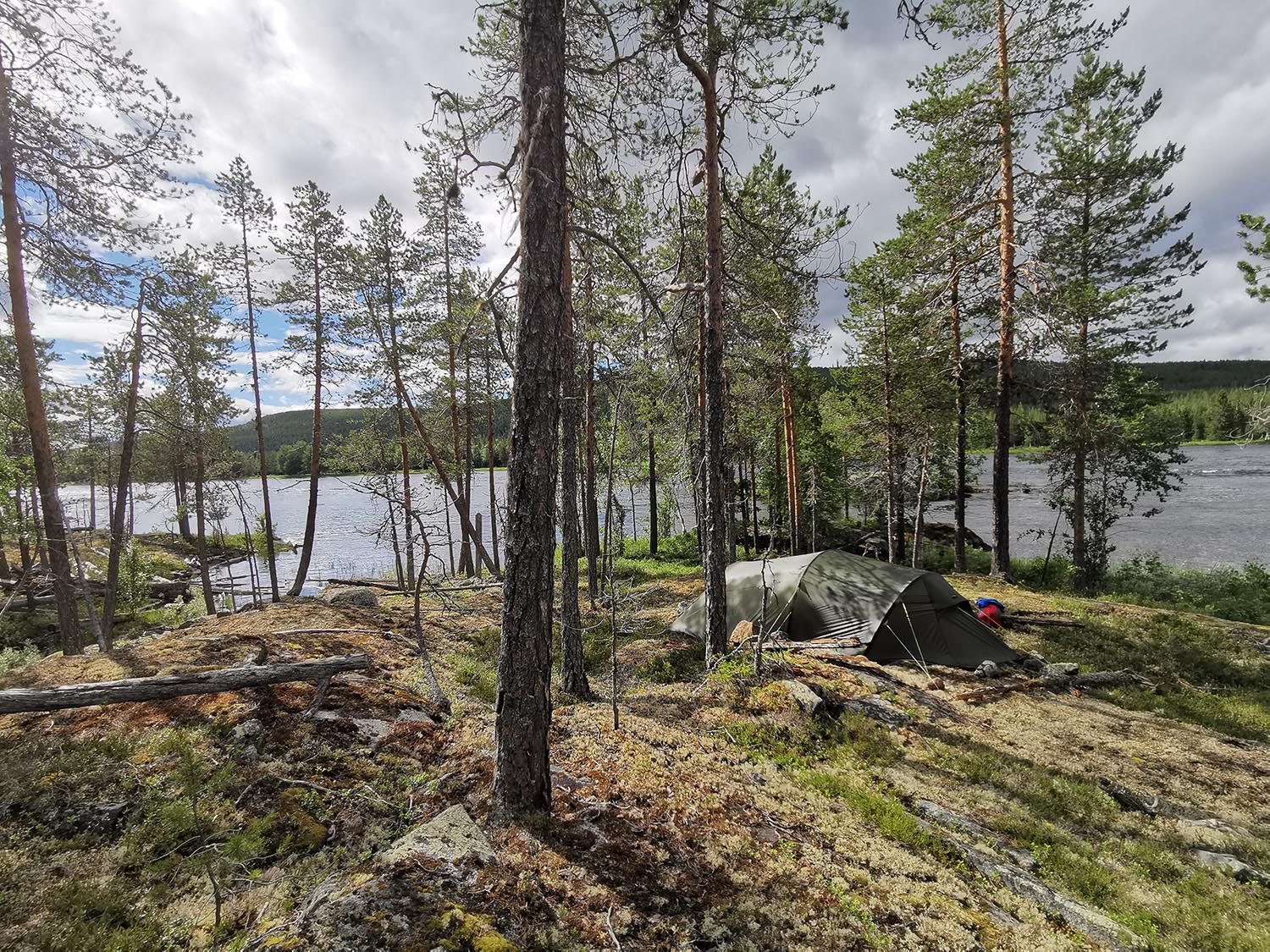 Sedan fortsatte vi upp efter norra sidan älven en bit och kollade ut en bra plats att slå läger på. Platsen blev på några fina hällar vid övre Ljusselet. När vi precis kommit fram såg vi hur dom mörka molnen drog ihop sig och vi försökte skynda oss upp med tältet. Snabbt kom det kraftigt regn och vind och vi fick verkligen jobba för att få tältet att stå på plats. I och med att underlaget var sten så var det omöjligt att få fast några tältpinnar, men vi var kreativa och knöt fast tältsnörena i träd, stockar och stenar och till slut var tältet uppe. Vi kröp in och gömde oss för regnet en stund och tryckte lite godis. Energin i kroppen började ta slut och vi var riktigt hungriga. Som tur var slutade det regna väldigt snabbt så vi kunde gå ut och sätta igång med maten.