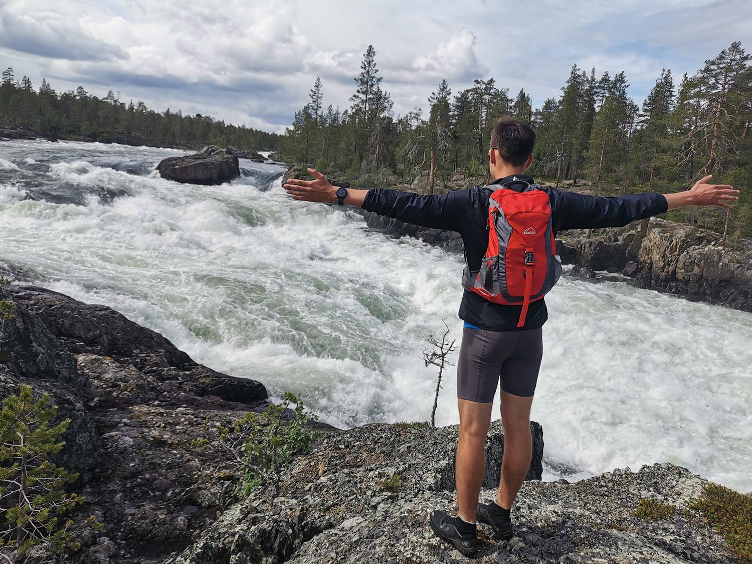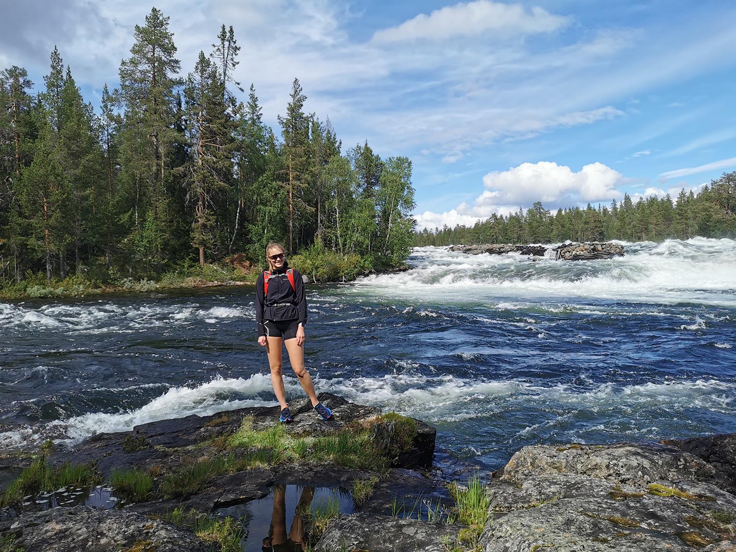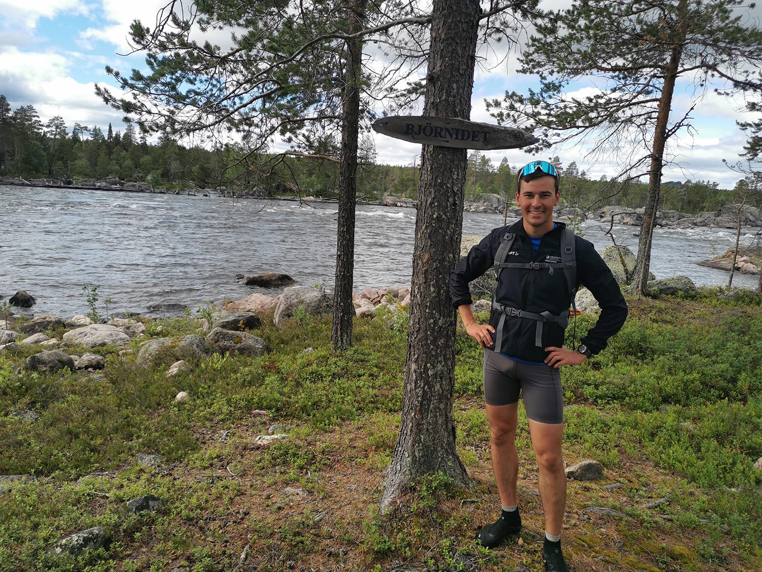 Stigen fortsatte att följa älven och vi fick springa i fin terräng. Den gick ner till lite olika forsar längs älven, bland annat Björnideforsen. Där såg vi fina forsar med stenkistor och mycket spår från flottningen, vilket var kul att se. Spår från flottningstiden var något vi såg under hela vårt äventyr då det varit en betydande del i Piteälvens historia.
