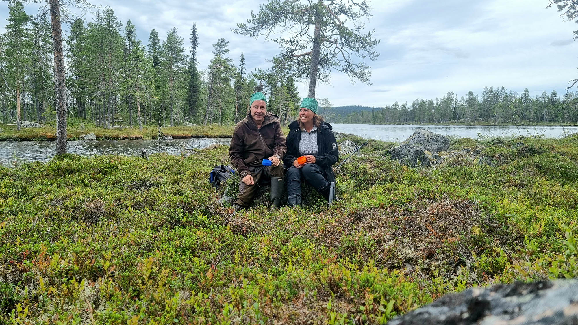 Nu närmar vi oss Nimteksjön där vi planerat för en lättare lunch. Vägen ner mot sjön blir sämre ju längre ner vi kommer. Väl där framme, efter cirka 4 km, så blir det lite fiske. Vid sjön blir det kaffe och smörgåsar och en välförtjänt vila.