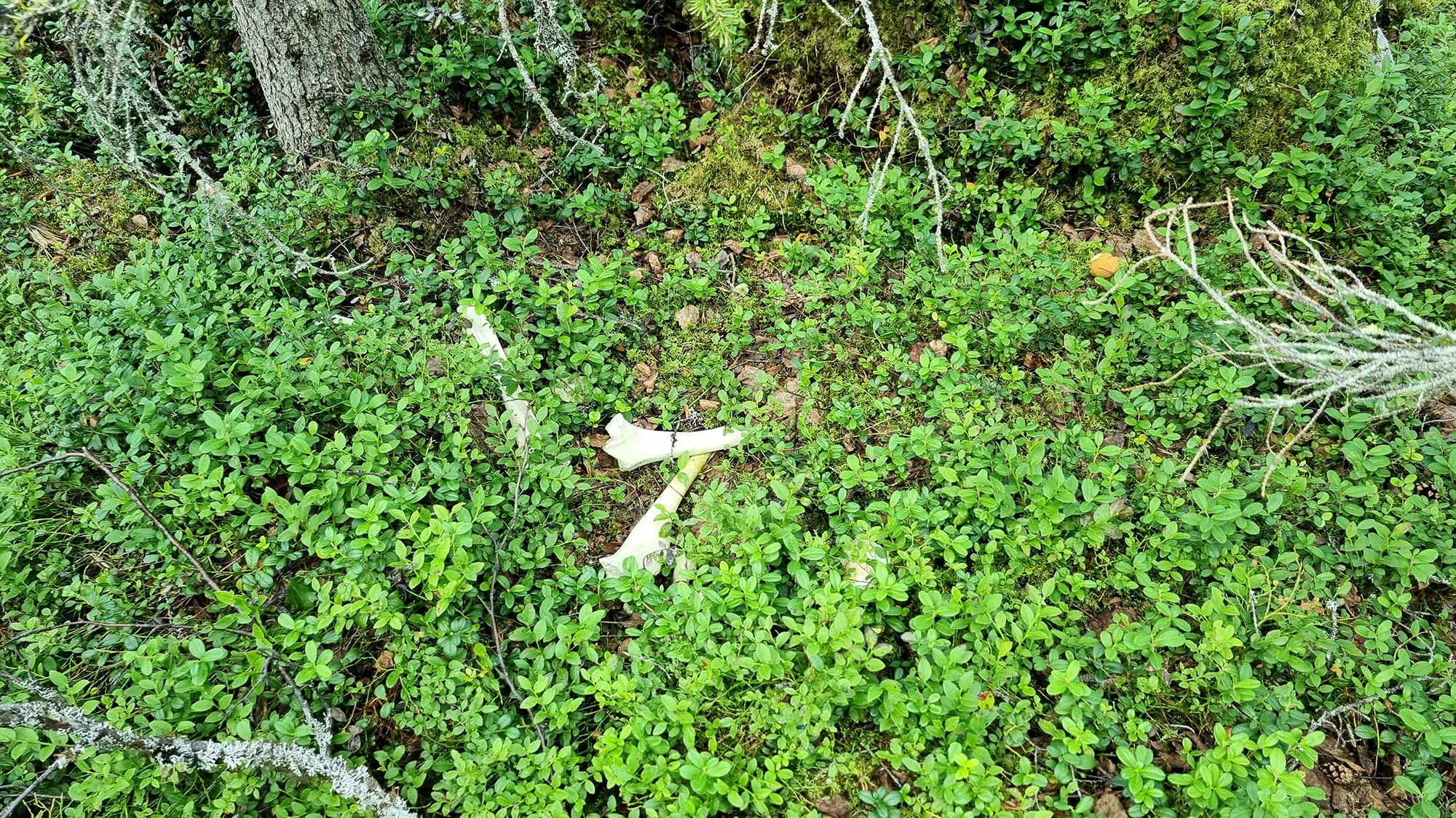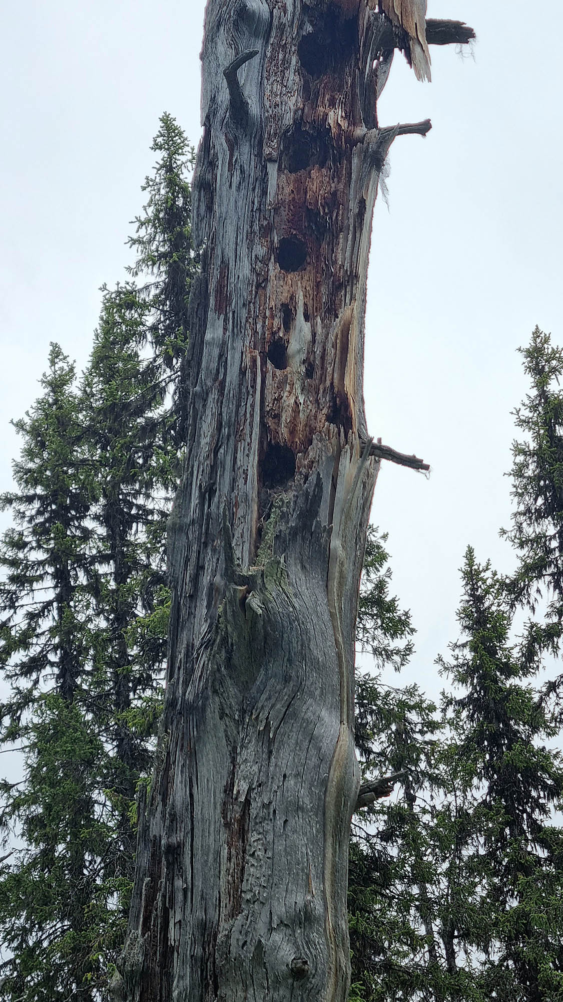Nu är det med stor förväntan vi startar vår vandring vid vägslutet av Nimtekvägen strax öster om sjön Tjålmage. Vi kommer ganska direkt till lite ungskog, det är lite snårigt och kuperat. Efter cirka 1 km kommer vi in i skogen vi längtat att vandra i, gammal granskog med inslag av tallar. Här skrämmer vi upp 5-6 tjädrar som snabbt försvinner in bland granarna. Det verkade vara årets kull, inga större tjädrar som kan skrämma livet ur en när de flyger upp.