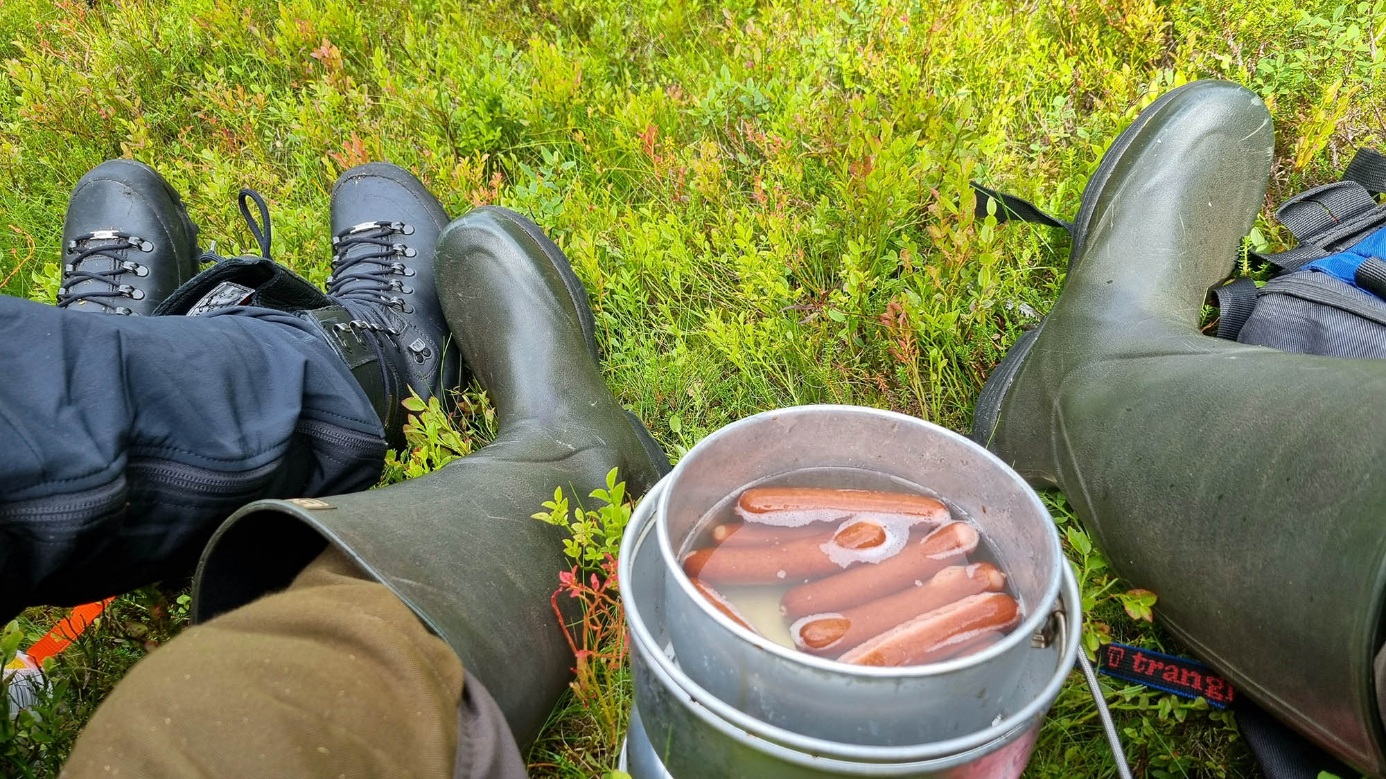 Därefter är det bara 500 m till vår underbara övernattningsplats. Den visar sig vara över förväntan (eller så var vi så trötta att vi uppskattade det mesta 😊). Snabbt som bara den så reser vi tält, lagar mat och äter den godaste middagen man kan tänka sig efter en lång vandringsdag: snabbmakaroner och älgköttbullar, helt magiskt gott. Här hinner jag också prova fiska lite utan någon större framgång.