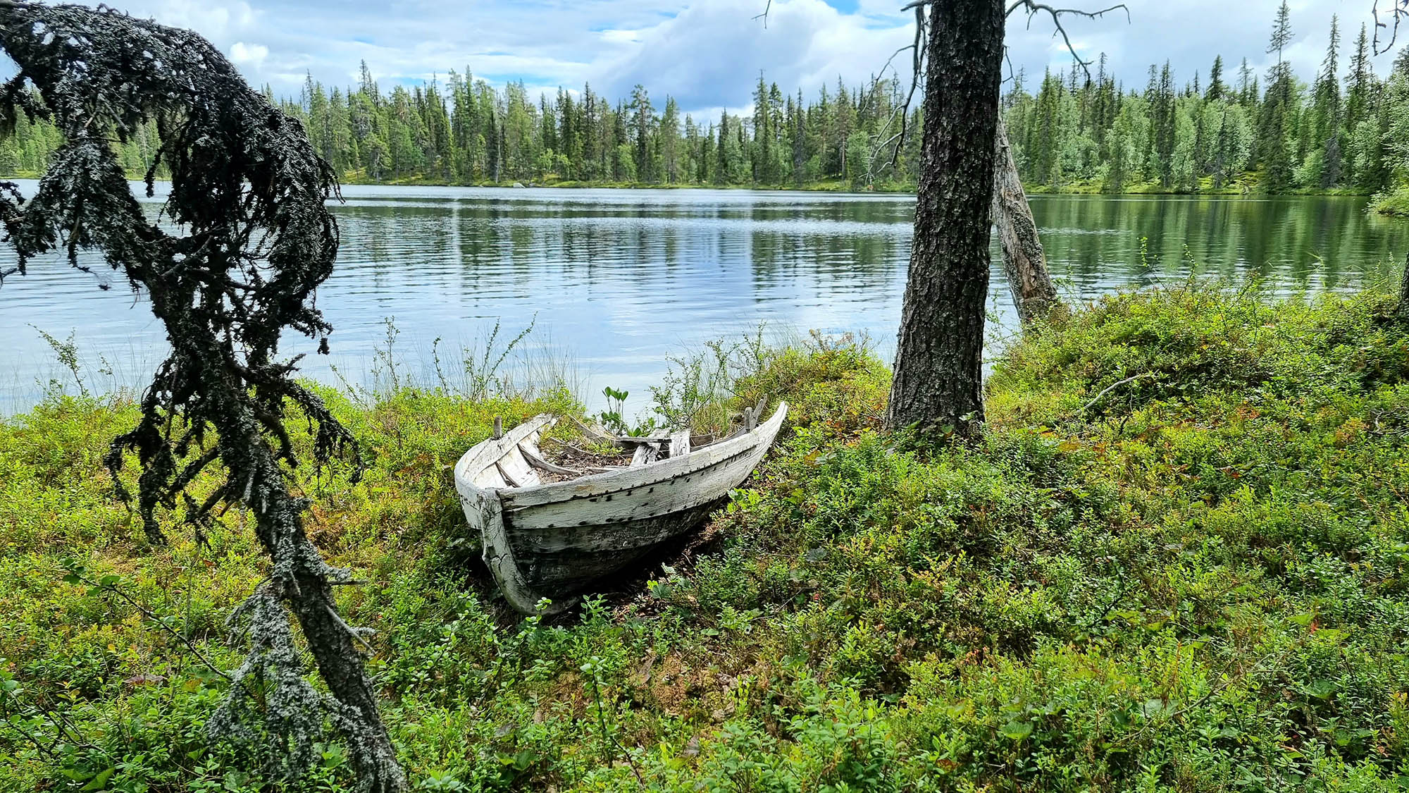 Men efter dessa hårda km så blev ändå terrängen bättre. Efter en välbehövd lunch med Bullens pilsnerkorv på menyn så började ändå lite ork hitta tillbaka. Nu var det bara sluttampen på vandringen kvar. Den blandade och gav med både bra och fina partier och lite sämre partier. Nu gick vi för att komma till cyklarna. Vi hade inte sett mycket av mänskliga spår men i slutat av vandringen fanns en äldre båt.