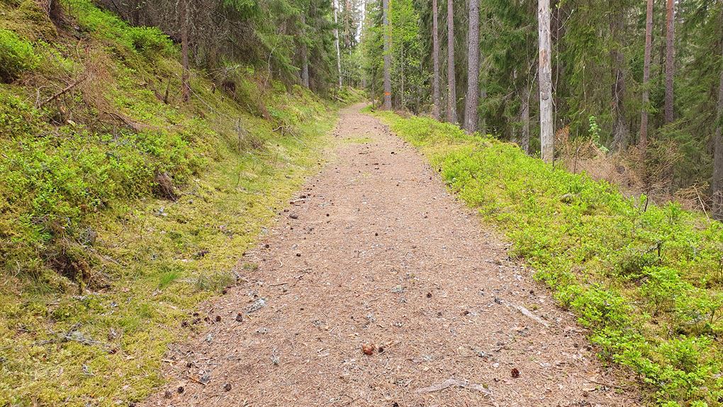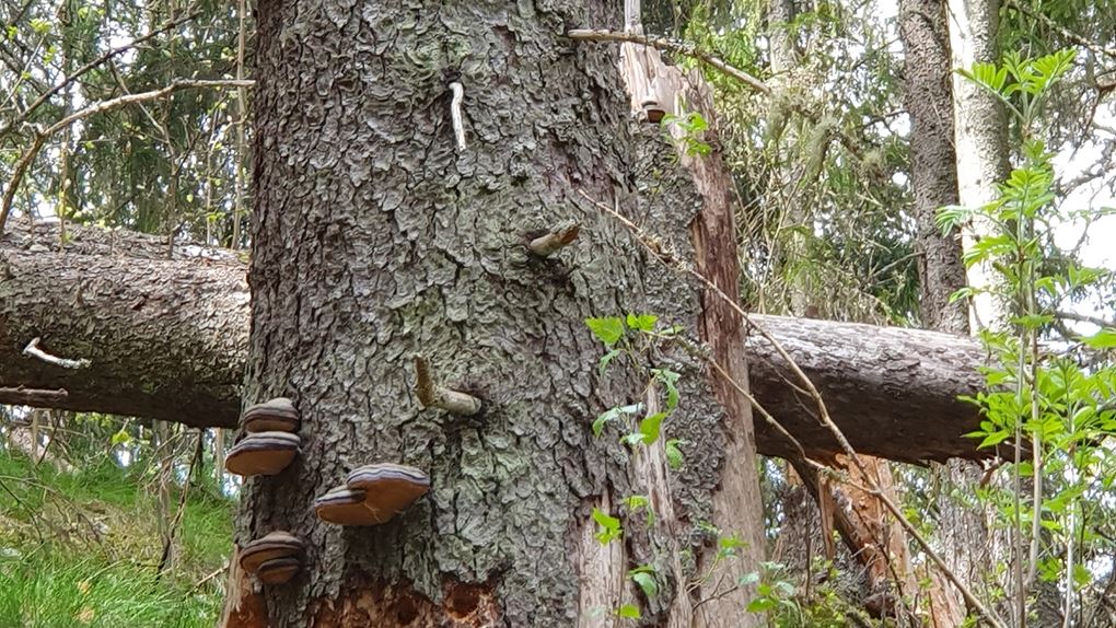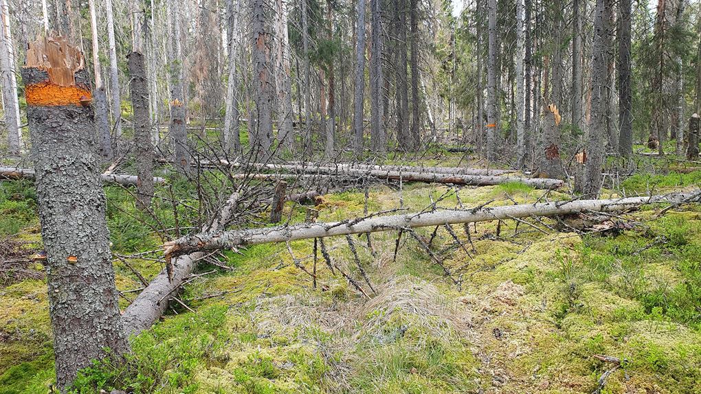 Vi fortsatte på Bruksleden genom skogen och kunde se hur granbarkborren angripit många träd längs leden. Flera stammar hade fallit omkull vilket gjorde vandringen krävande.