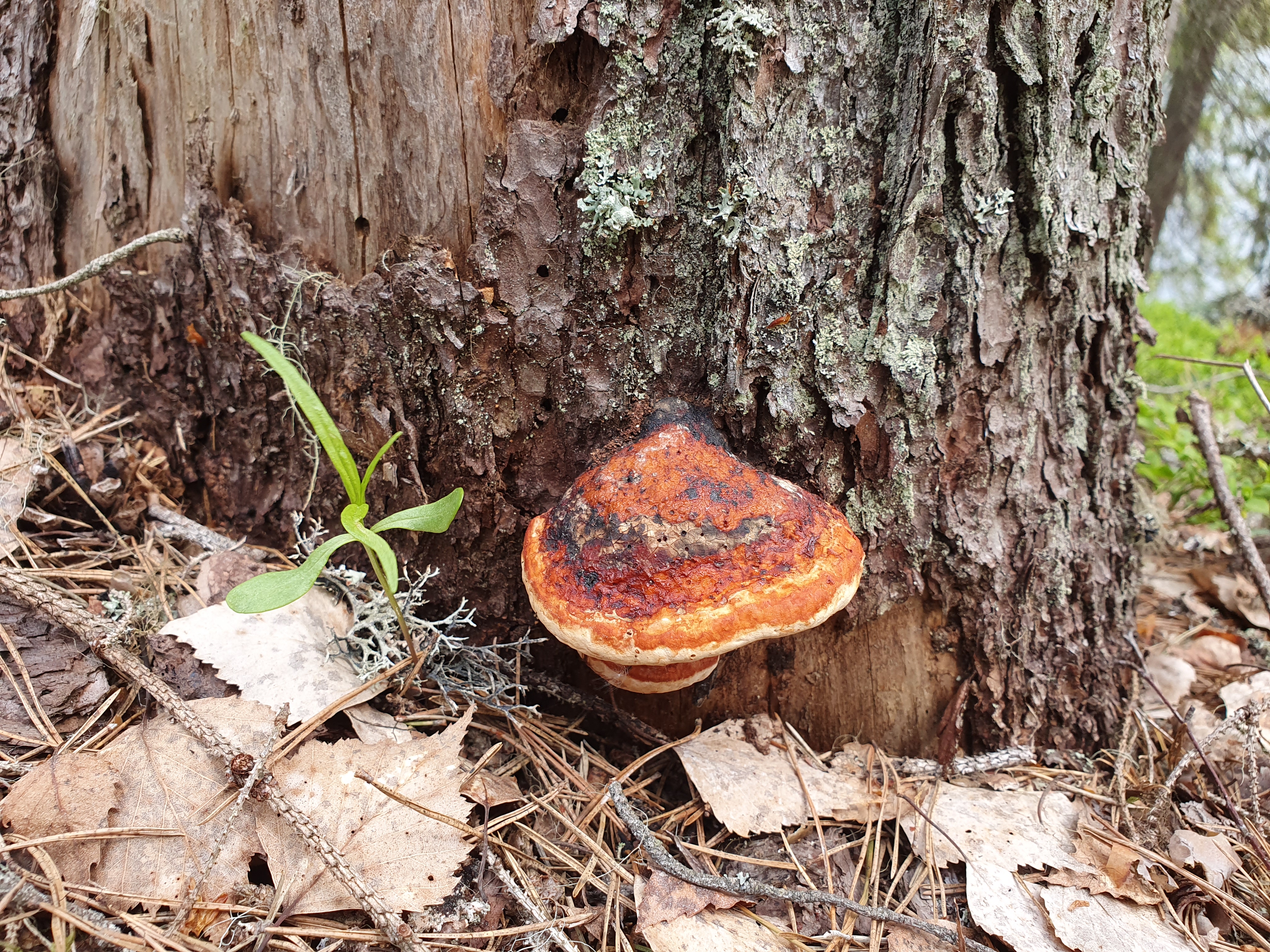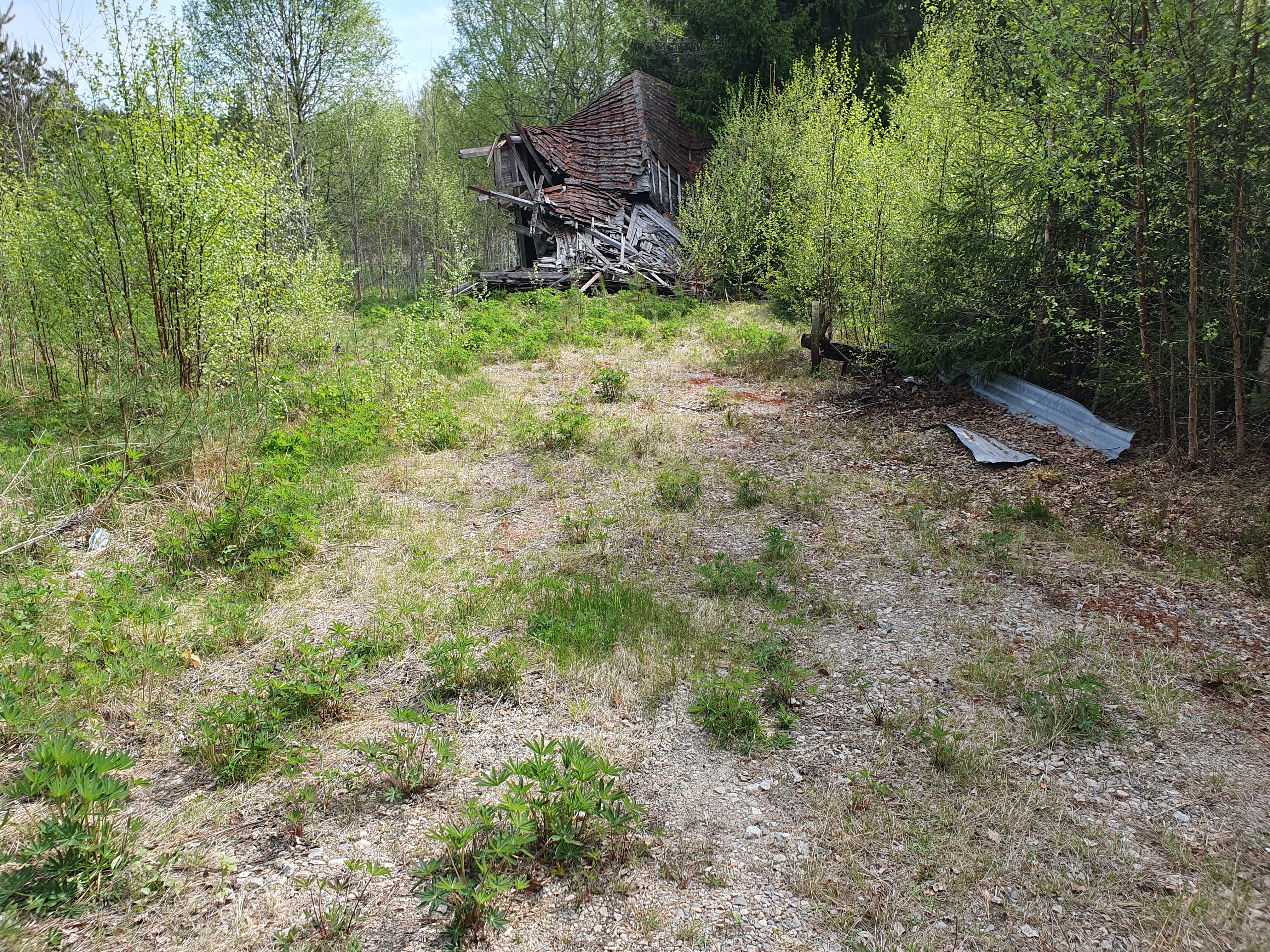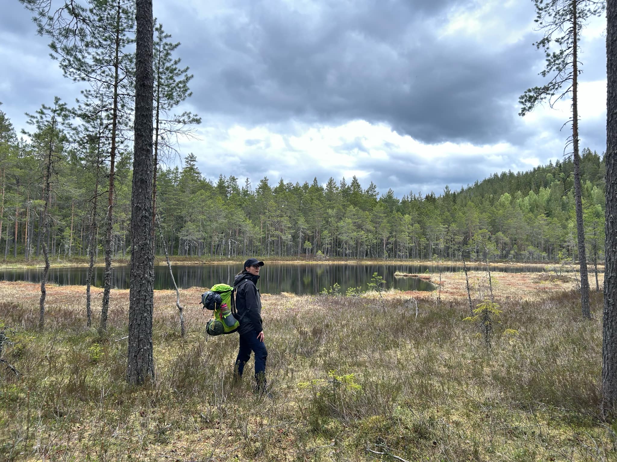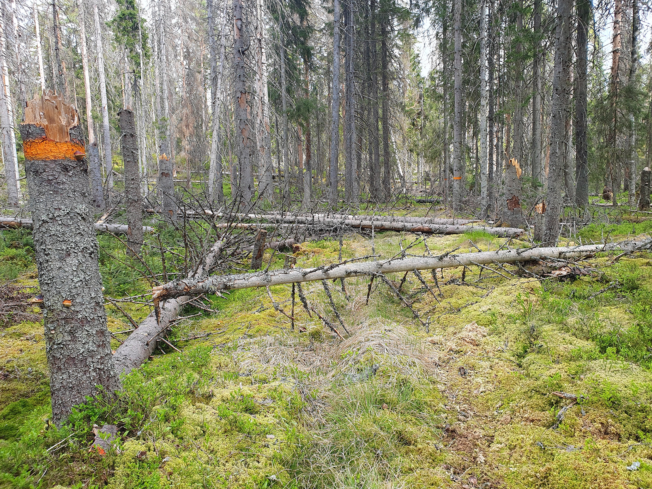 Efter en lugn natt vände vi tillbaka på bruksleden för att sedan vika av på grusvägen söderut mot Stora Laxsjön. Vi såg mer av granbarkborrens angrepp vilket gav en spöklik känsla men också nya granar på väg upp. När vi passerade blötare partier kunde vi känna en aromatisk doft. Kanske skvattram eller pors?