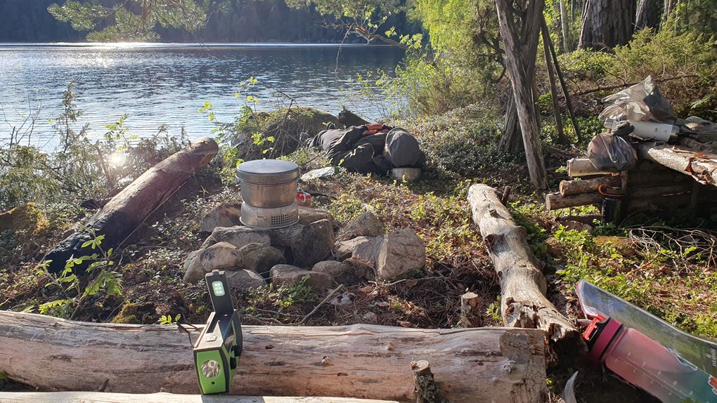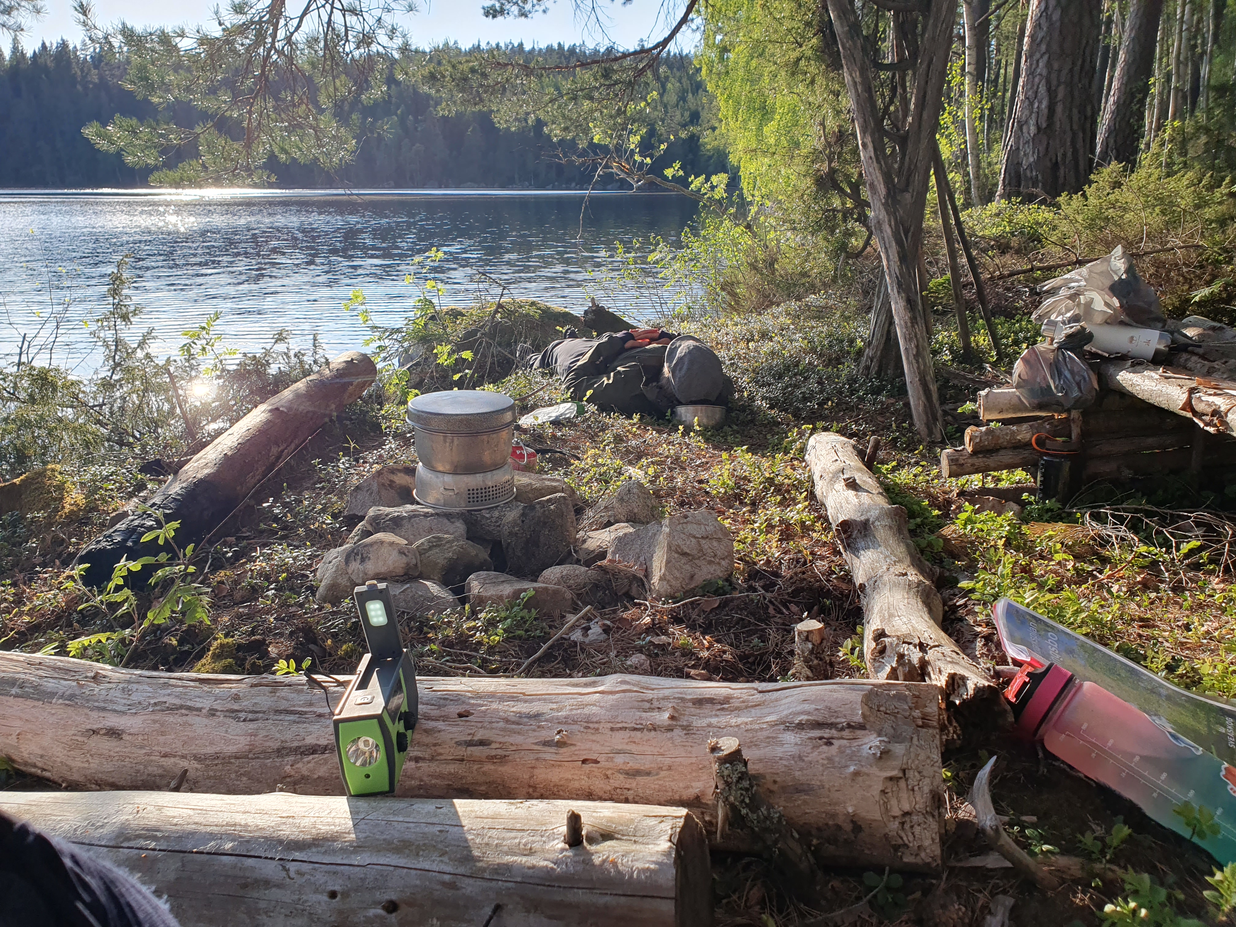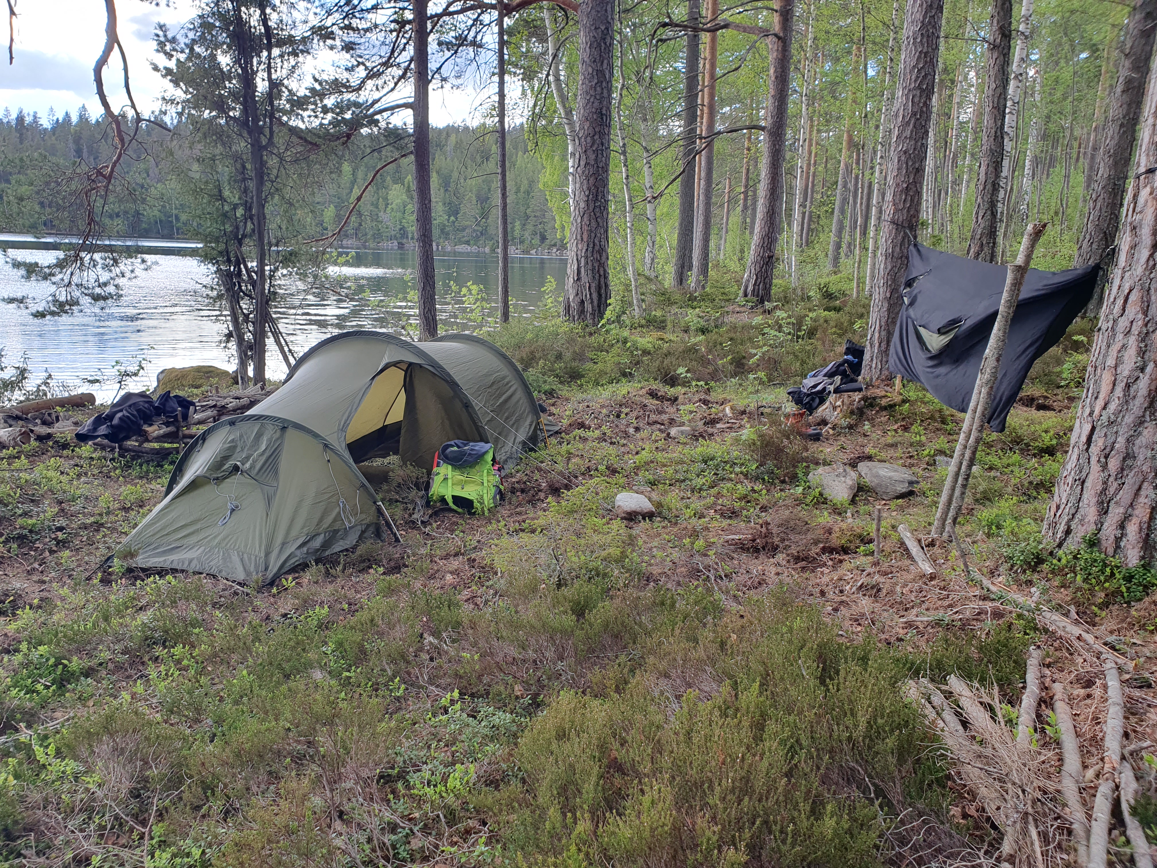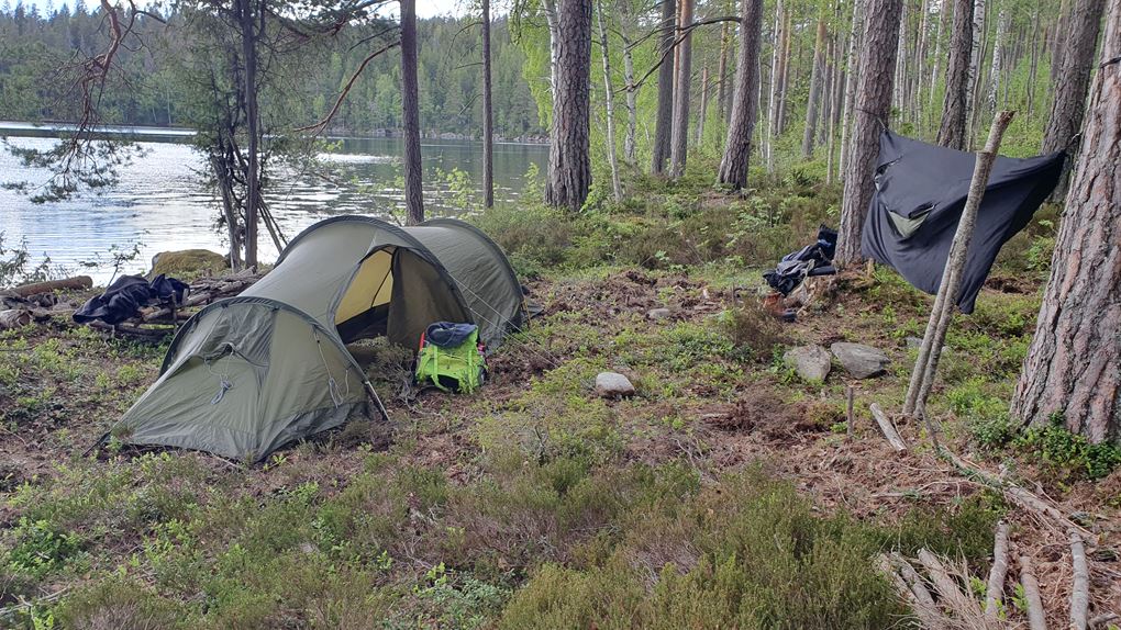 Framme vid Västra Skälsjön hittade vi en fin lägerplats vid sjökanten med en enkel sittbänk och en grillplats. Här slog vi upp tält och hängmatta och njöt av mat och varm kvällssol.