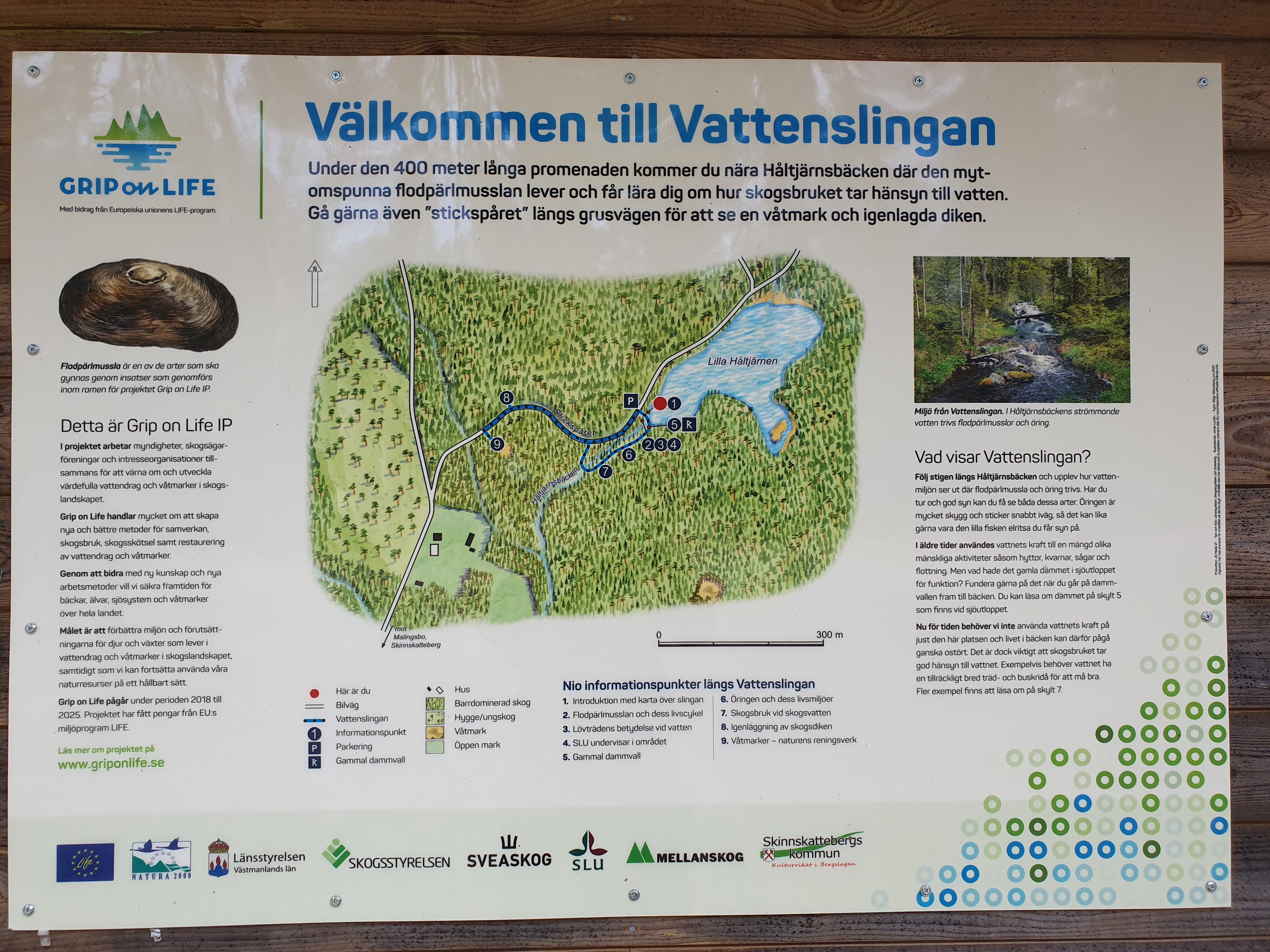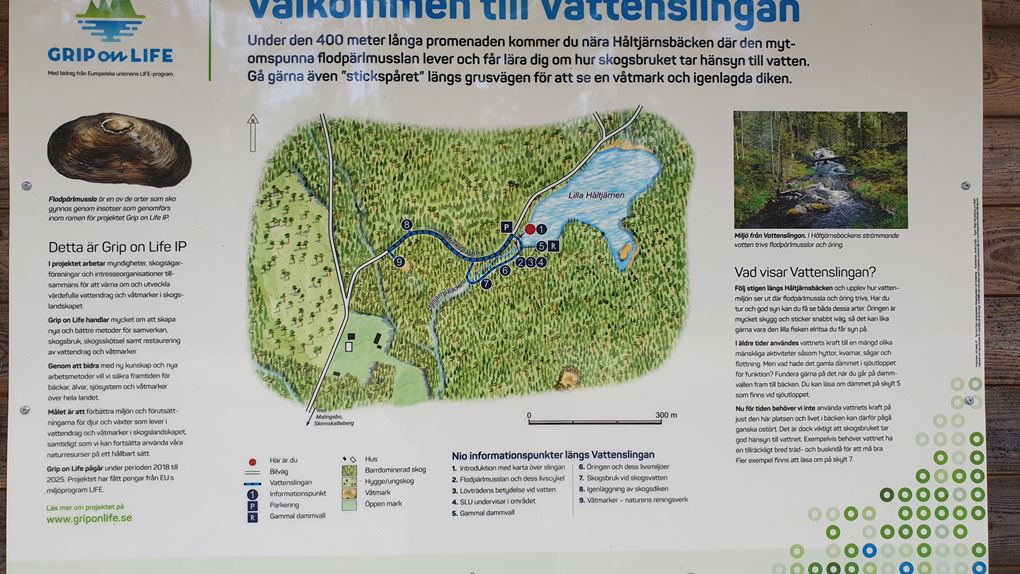 Vid Natura 2000-området Håltjärnsbäcken var allt mycket fint anordnat med informationstavlor och en gångslinga precis intill vattnet. Där fick vi se våra första flodpärlmusslor.