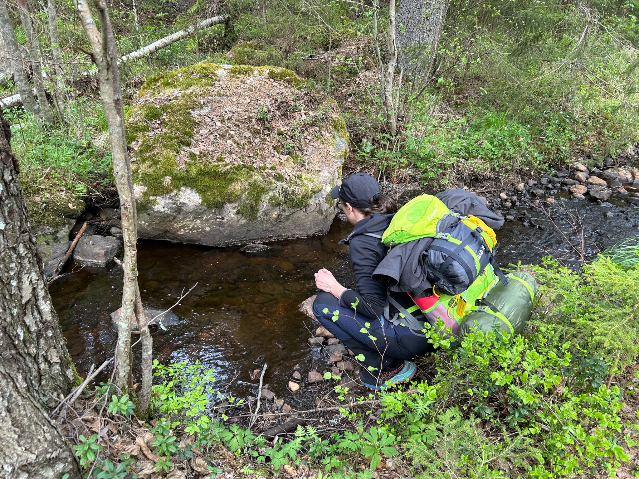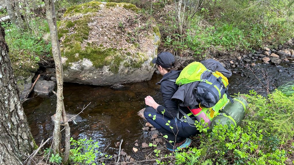 När Bruksleden passerade mellan Kuttersjön och Stora Laxsjön fanns ännu en skyltad kallkälla. Denna gång fanns det strömmande källvatten. Vi fyllde våra vattenflaskor och fortsatte mot Skälsjöarna för att slå läger för natten.