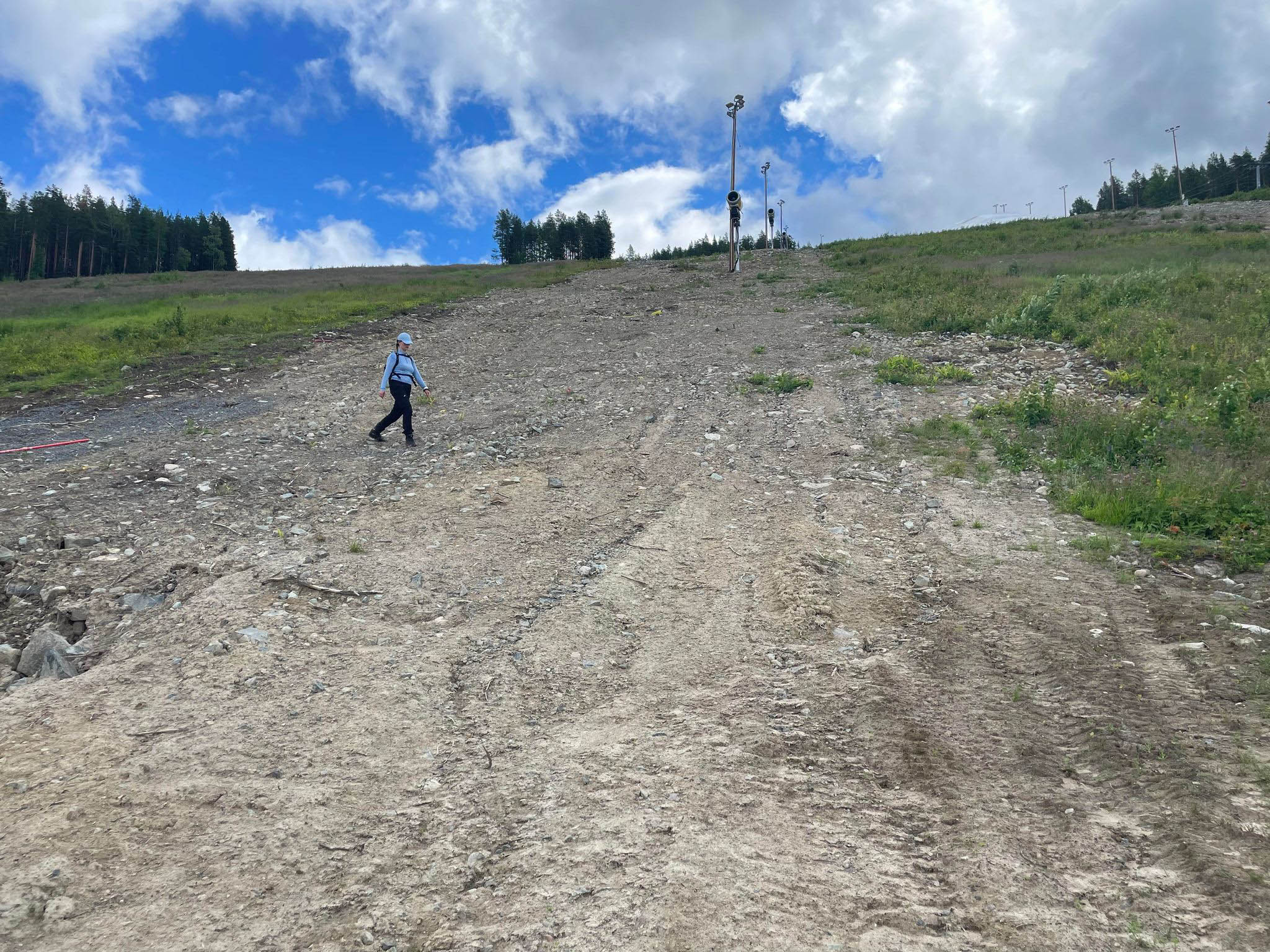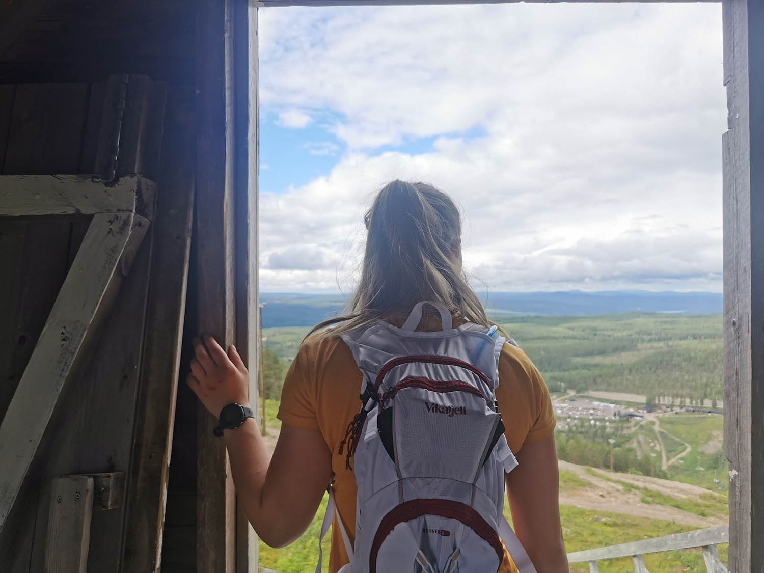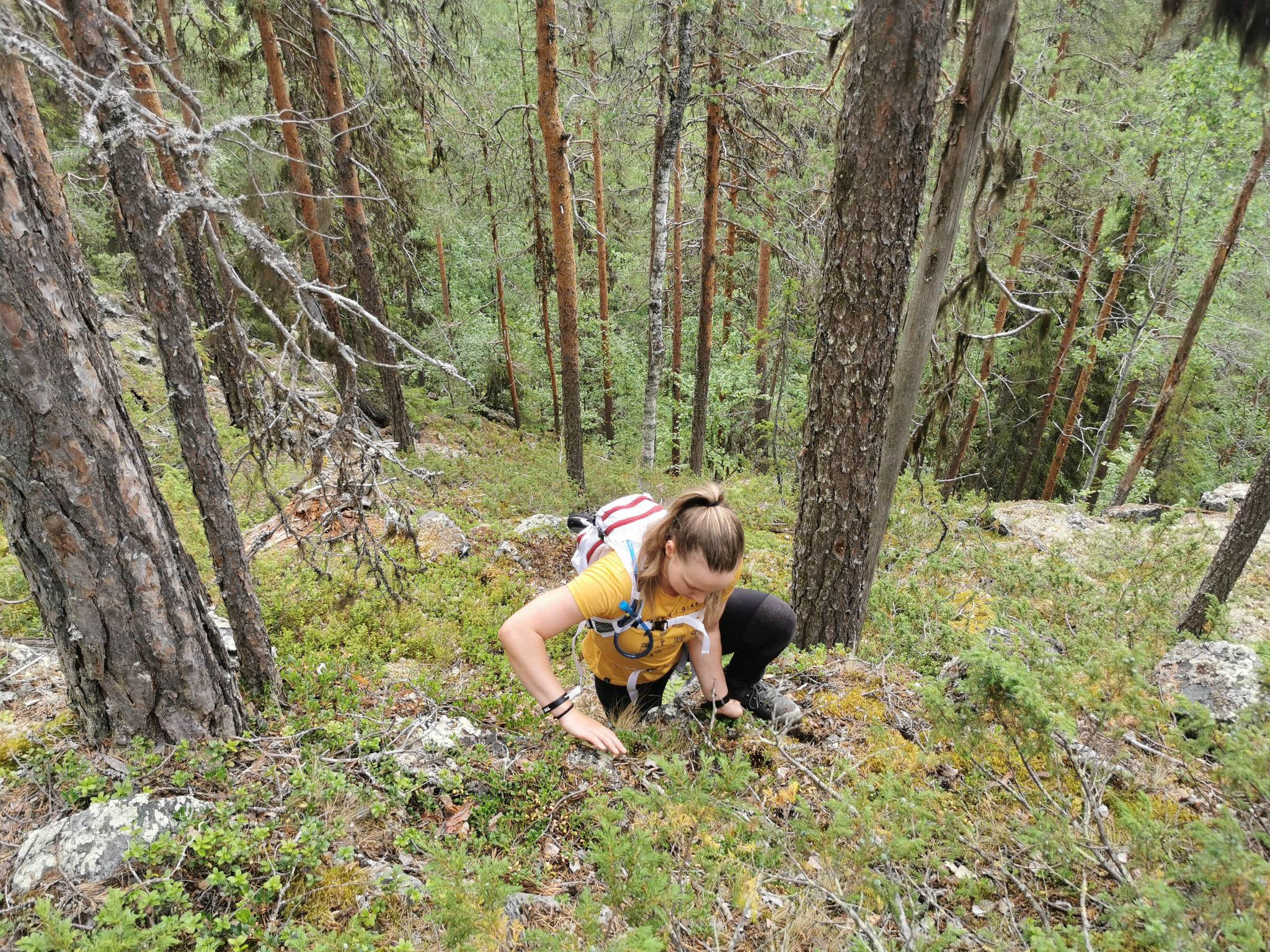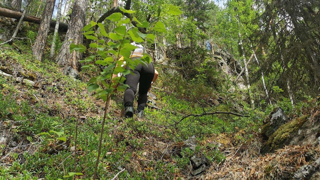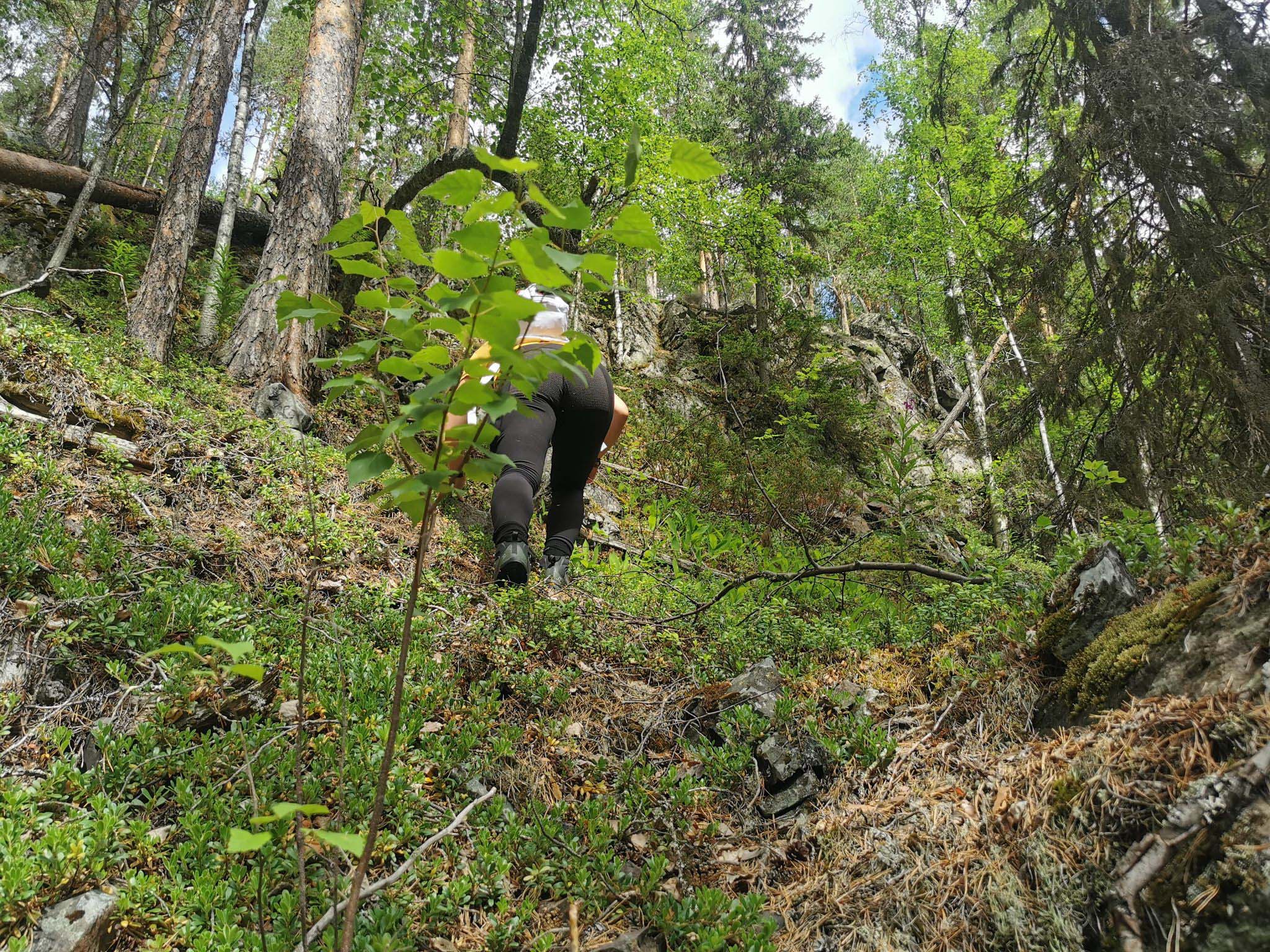 Vandringen fortsatte längs med skidspåret som under vintern är pistat. Under sommarhalvåret är det hedängar och blåbärsris man får traska igenom. Vi vek av mot skogen där terrängen var som bäst för att nå Storklintens topp via baksidan av berget. Här var terrängen bördig och vi hittade vad vi tror är den sällsynta blomman guckusko, men med små blad var det svårt att urskilja om den var i utvecklingsstadie eller om det var en annan växt. Terrängen övergick från bördig mark till en mer brant och utmanande stigning där våra klätterkunskaper kom till nytta. Detta var helt klart den mest utmanande passagen av vårt äventyr, en riktig pulshöjare. På vägen till toppen såg vi bland annat en ekorrfamilj, fina växter och en utsikt och bara blev vackrare för varje höjdmeter vi tog.