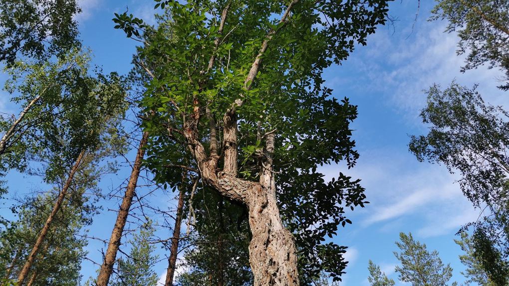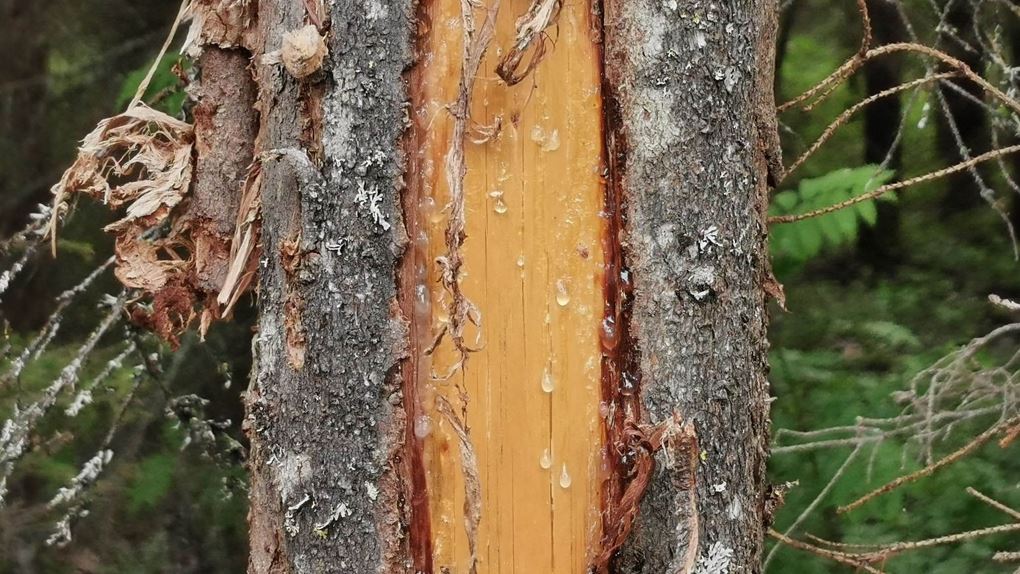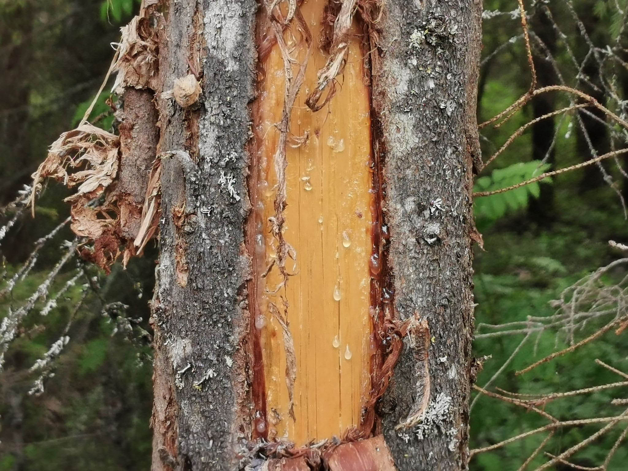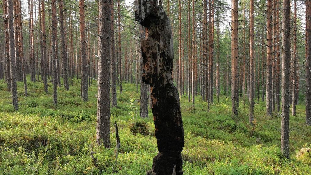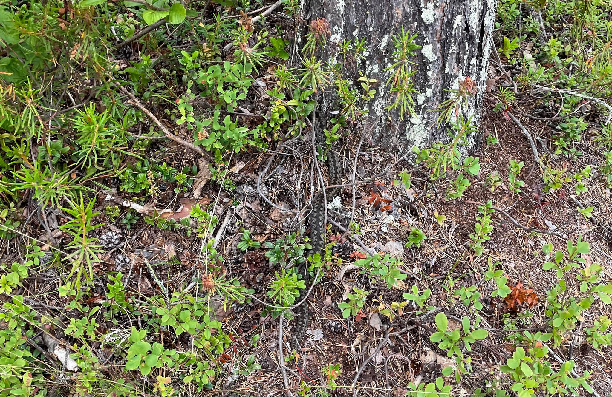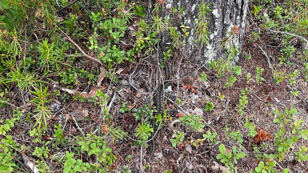Dessa växter följde oss hela vägen ner till bron där ena ekoparksbänken fanns. Där svängde vi av mot Flarktjärnvägen och vårt nästa uppehåll som var den sällsynta ormgranen. Cyklarna parkerade vi vid vägkanten och påbörjade vår vandring genom orörd terräng som bestod av tallhedar, myrmark och även ett litet vad. Även ormgranen var svår att finna och vi tog oss ut ur skogen blöta men förväntansfulla inför nästa sevärdhet som var Gruvberget.