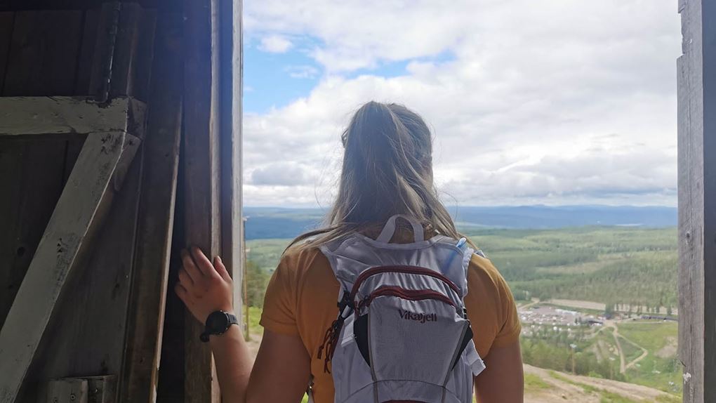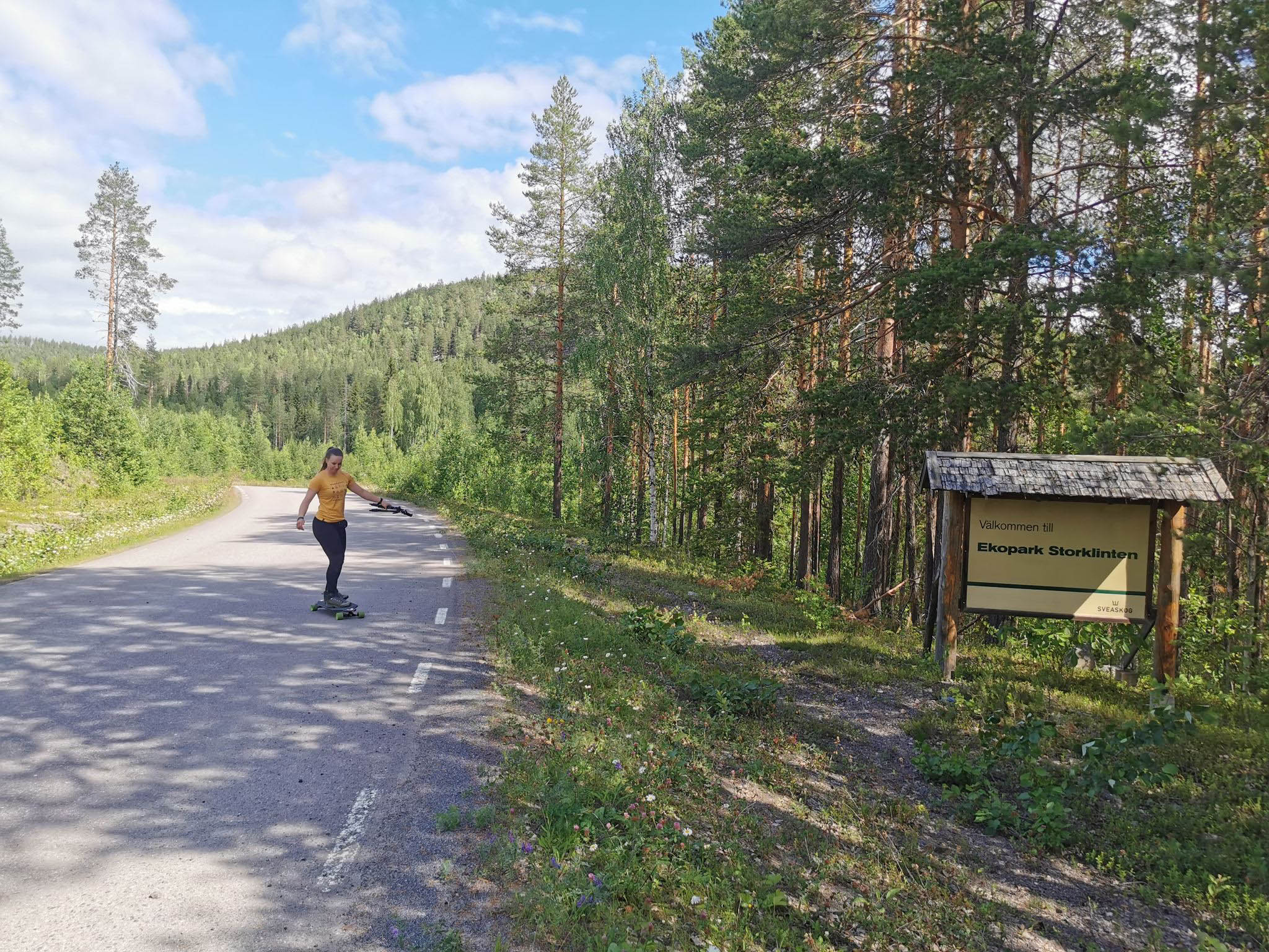 Väl uppe på toppen var utsikten oslagbar och vi tog oss en välförtjänt paus innan vi påbörjade färden ner för backen mot parkeringsplatsen där vi lämnat en av bilarna dagen innan. Där plockade vi fram våra longboards och sista sträckan mot ekoparksbänken bestod av cruising på den asfalterade vägen. Solen hade nu börjat titta fram helt och vägen hade torkat. Det kändes som ett bra beslut att ha vänt på rutten och ta longboard etappen sist. Väl framme vid ekoparksbänken slutade vårt äventyr som blev hela 26 kilometer och det som återstod var att hämta cyklarna. Nöjda, blöta och ett äventyr rikare begav vi oss sedan hemåt.