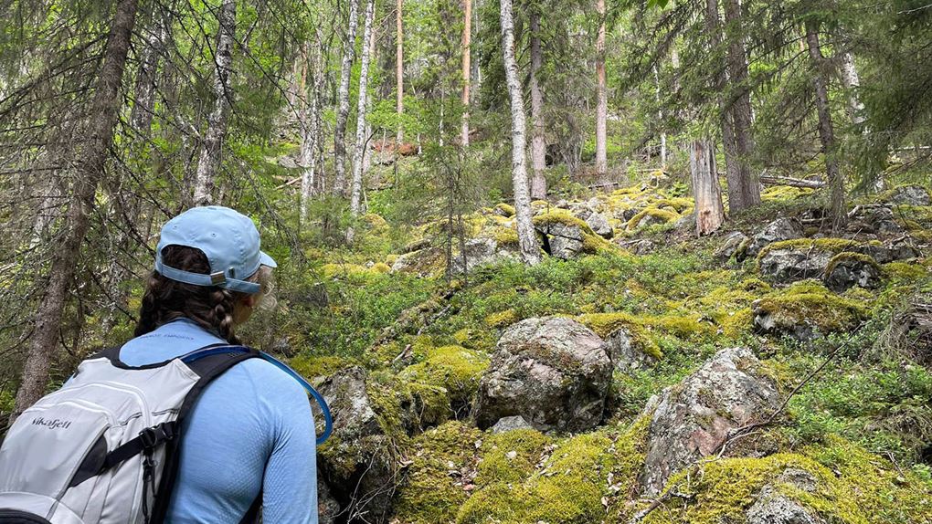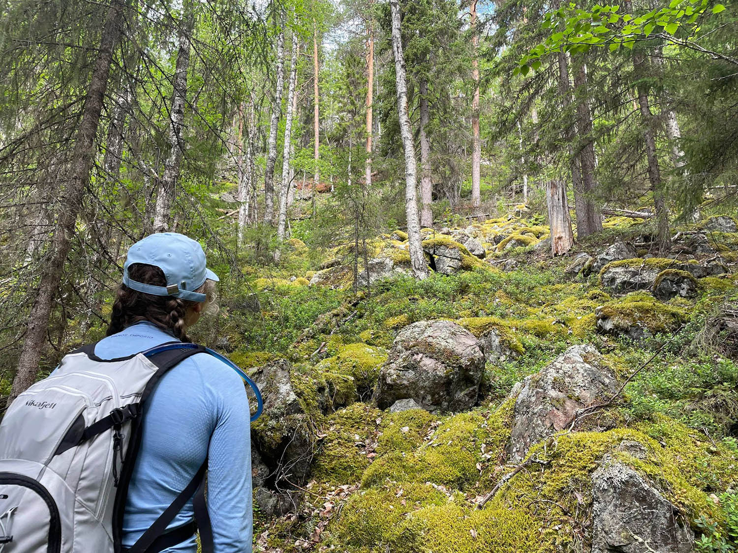 Vi lämnade cyklarna vid Gruvbergsleden och fortsatte till fots längs den välmarkerade stigen. Regnet hade nu avtagit och solens strålar hade börja nå marken genom den täta skogen. Längs med vår vandring såg vi bland annat de stora jätteasparna och gruvhål från en svunnen tid. Efter gruvhålen avvek vi från stigen ner mot orörd terräng som därefter skulle leda oss till stigen vid Hundsjön som var dagens slutmål.