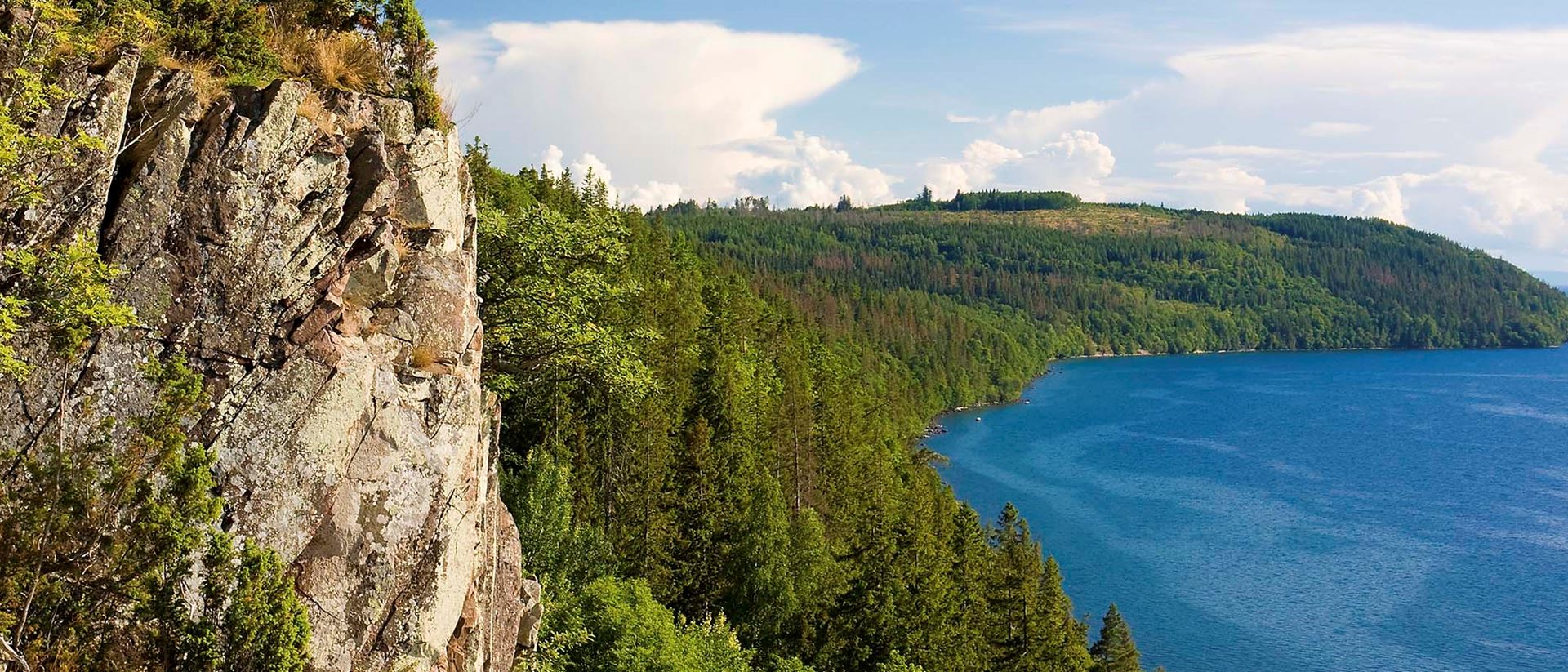 En milslång rasbrant med naturskogar sätter också stor prägel på landskapet. Du kan njuta av den fantastiska utsikten från Hjässan - Ombergs högsta punkt - och vandra bland jätteekar och månghundraåriga granar, eller låta dig fängslas av de vackra orkidéerna som finns i Ombergs många kalkkärr.